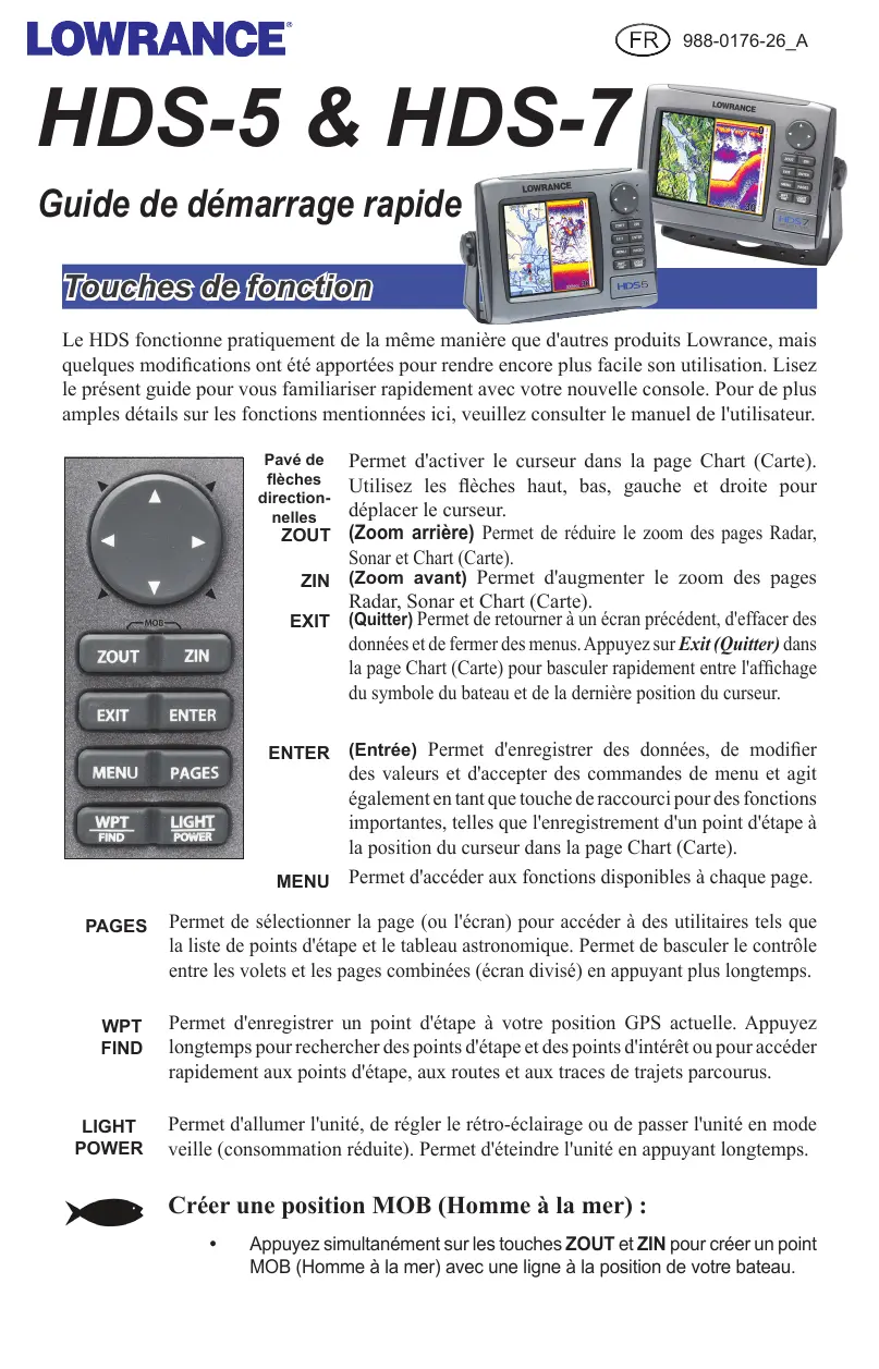988-0176-26_A HDS-5 & HDS-7 Guide de démarrage rapide Touches de fonction Le HDS fonctionne pratiquement de la même manière que d'autres produits Lowrance, mais quelques modifications ont été apportées pour rendre encore plus facile son utilisation. Lisez le présent guide pour vous familiariser rapidement avec votre nouvelle console. Pour de plus amples détails sur les fonctions mentionnées ici, veuillez consulter le manuel de l'utilisateur. Permet d'activer le curseur dans la page Chart (Carte). Utilisez les flèches haut, bas, gauche et droite pour déplacer le curseur. ZOUT (Zoom arrière) Permet de réduire le zoom des pages Radar, Sonar et Chart (Carte). ZIN (Zoom avant) Permet d'augmenter le zoom des pages Radar, Sonar et Chart (Carte). EXIT (Quitter) Permet de retourner à un écran précédent, d'effacer des données et de fermer des menus. Appuyez sur Exit (Quitter) dans la page Chart (Carte) pour basculer rapidement entre l'affichage du symbole du bateau et de la dernière position du curseur. Pavé de flèches directionnelles (Entrée) Permet d'enregistrer des données, de modifier des valeurs et d'accepter des commandes de menu et agit également en tant que touche de raccourci pour des fonctions importantes, telles que l'enregistrement d'un point d'étape à la position du curseur dans la page Chart (Carte). MENU Permet d'accéder aux fonctions disponibles à chaque page. ENTER PAGES Permet de sélectionner la page (ou l'écran) pour accéder à des utilitaires tels que la liste de points d'étape et le tableau astronomique. Permet de basculer le contrôle entre les volets et les pages combinées (écran divisé) en appuyant plus longtemps. WPT FIND Permet d'enregistrer un point d'étape à votre position GPS actuelle. Appuyez longtemps pour rechercher des points d'étape et des points d'intérêt ou pour accéder rapidement aux points d'étape, aux routes et aux traces de trajets parcourus. LIGHT POWER Permet d'allumer l'unité, de régler le rétro-éclairage ou de passer l'unité en mode veille (consommation réduite). Permet d'éteindre l'unité en appuyant longtemps. Créer une position MOB (Homme à la mer) :