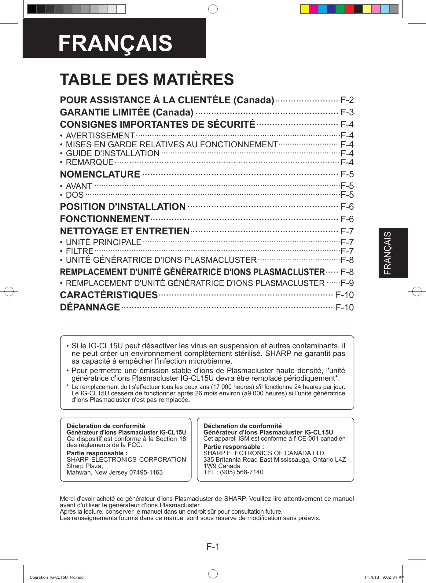 Déclaration de conformité Générateur d'ions Plasmacluster IG-CL15U Ce dispositif est conforme à la Section 8 des règlements de la FCC. Partie responsable : SHARP ELECTRONICS CORPORATION Sharp Plaza, Mahwah, New Jersey 07495-63