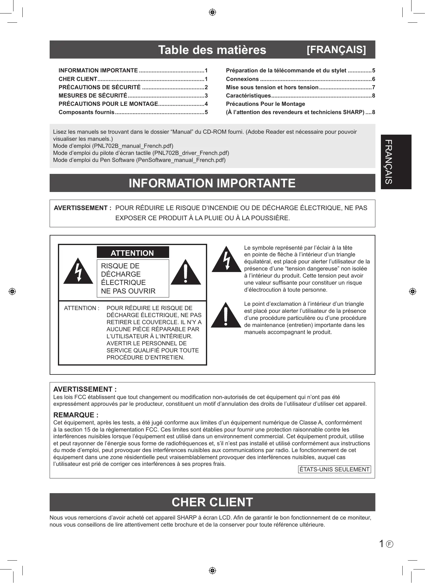 ÉTATS-UNIS SEULEMENT CHER CLIENT Nous vous remercions d’avoir acheté cet appareil SHARP à écran LCD. Afin de garantir le bon fonctionnement de ce moniteur, nous vous conseillons de lire attentivement cette brochure et de la conserver pour toute référence ultérieure.