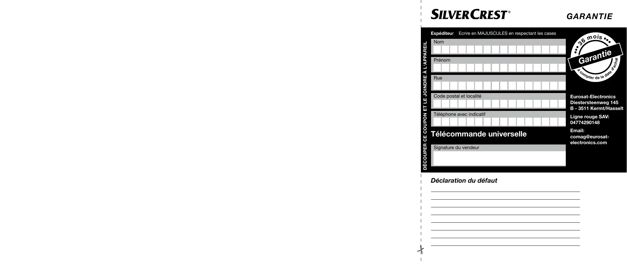 Télécommande universelle Signature du vendeur Déclaration du défaut