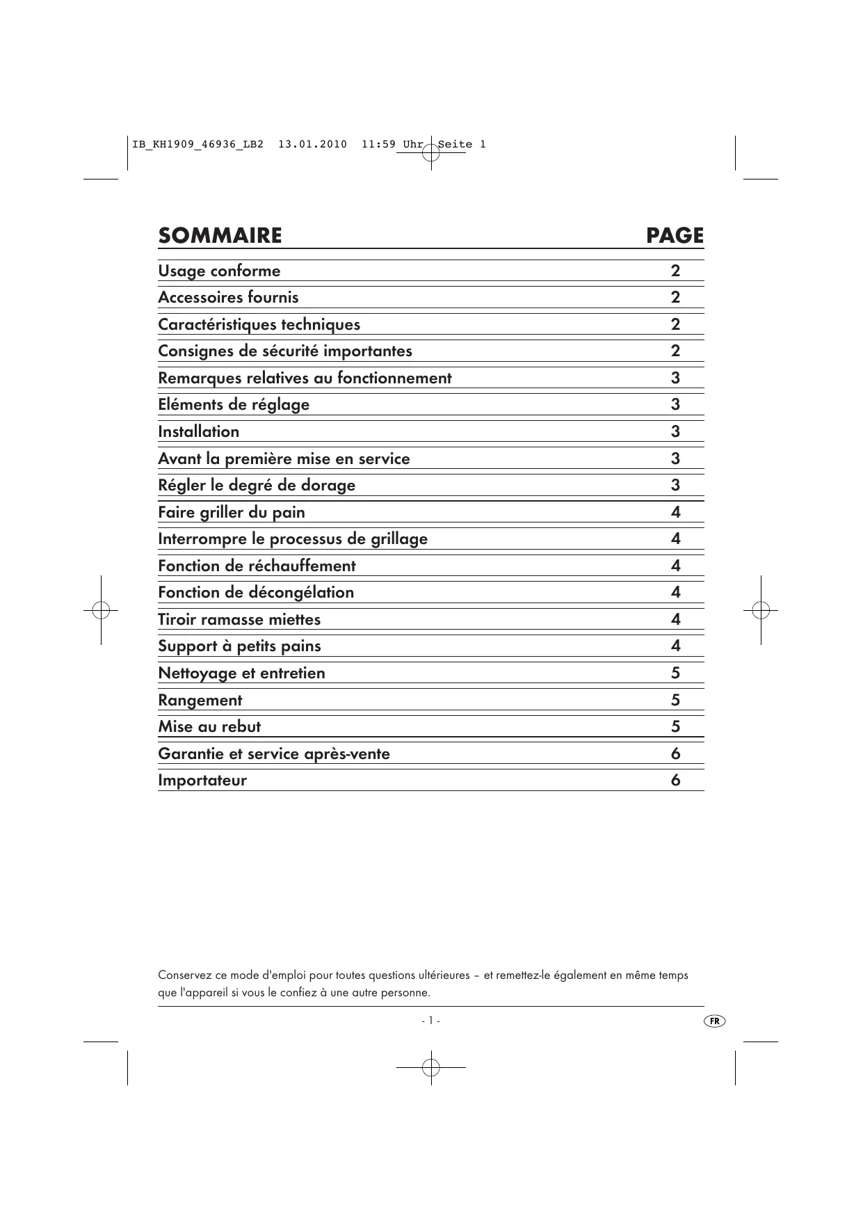 Usage conforme 2 Accessoires fournis 2 2 Consignes de sécurité importantes 2 Remarques relatives au fonctionnement 3 Éléments de réglage 3 Installation 3 Avant la première mise en service 3 Régler le degré de dorure 3 Faire griller du pain 4 Interrompre le processus de grillage 4 Fonction de réchauffement 4 Fonction de décongélation 4 Tiroir ramasse-miettes 4 Support à petits pains 4 Nettoyage et entretien 5 Rangement 5 Mise au rebut 5 Garantie et service après-vente 6 Importateur 6