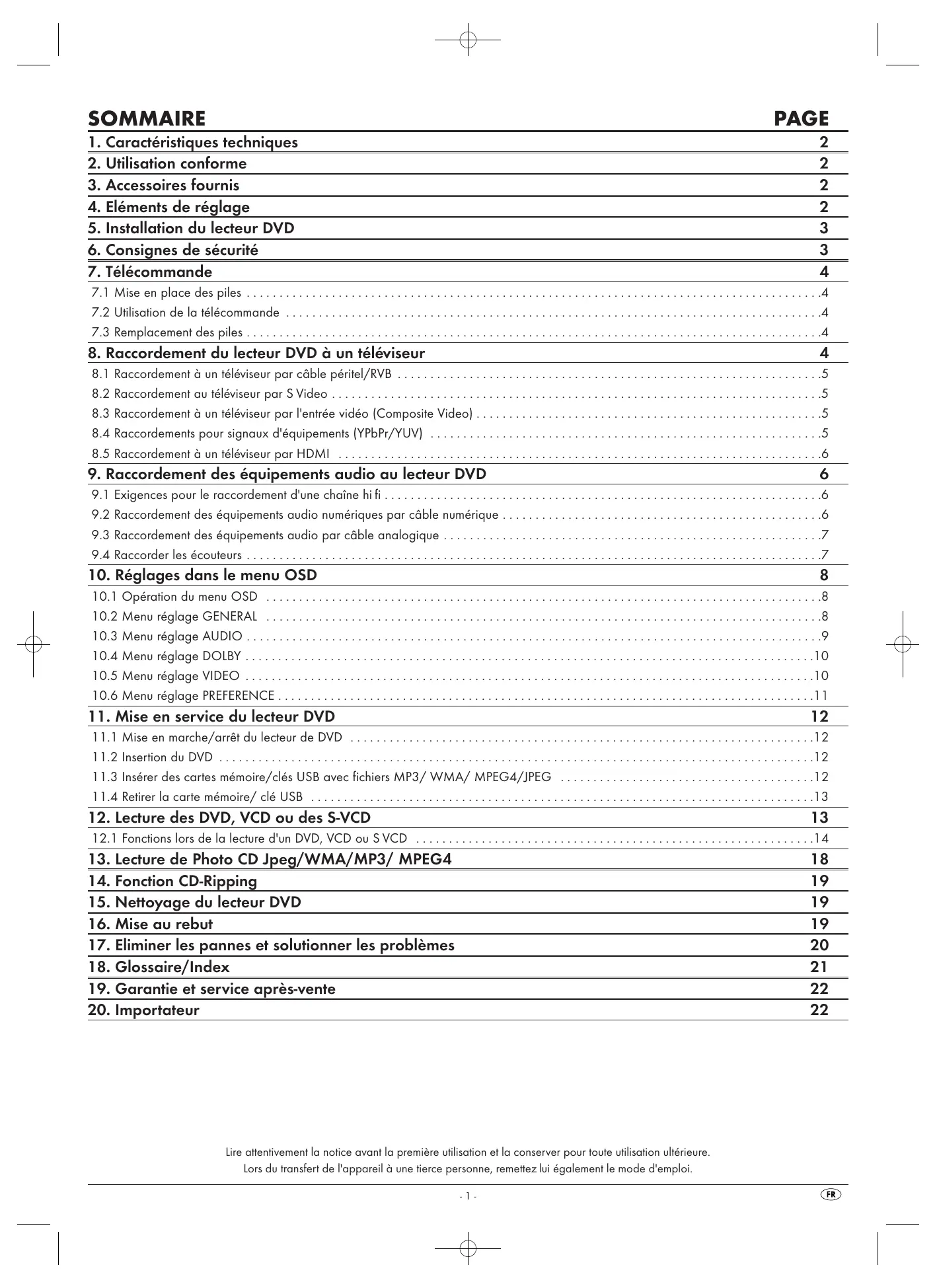 Lire attentivement la notice avant la première utilisation et la conserver pour toute utilisation ultérieure. Lors du transfert de l'appareil à une tierce personne, remettez lui également le mode d'emploi.