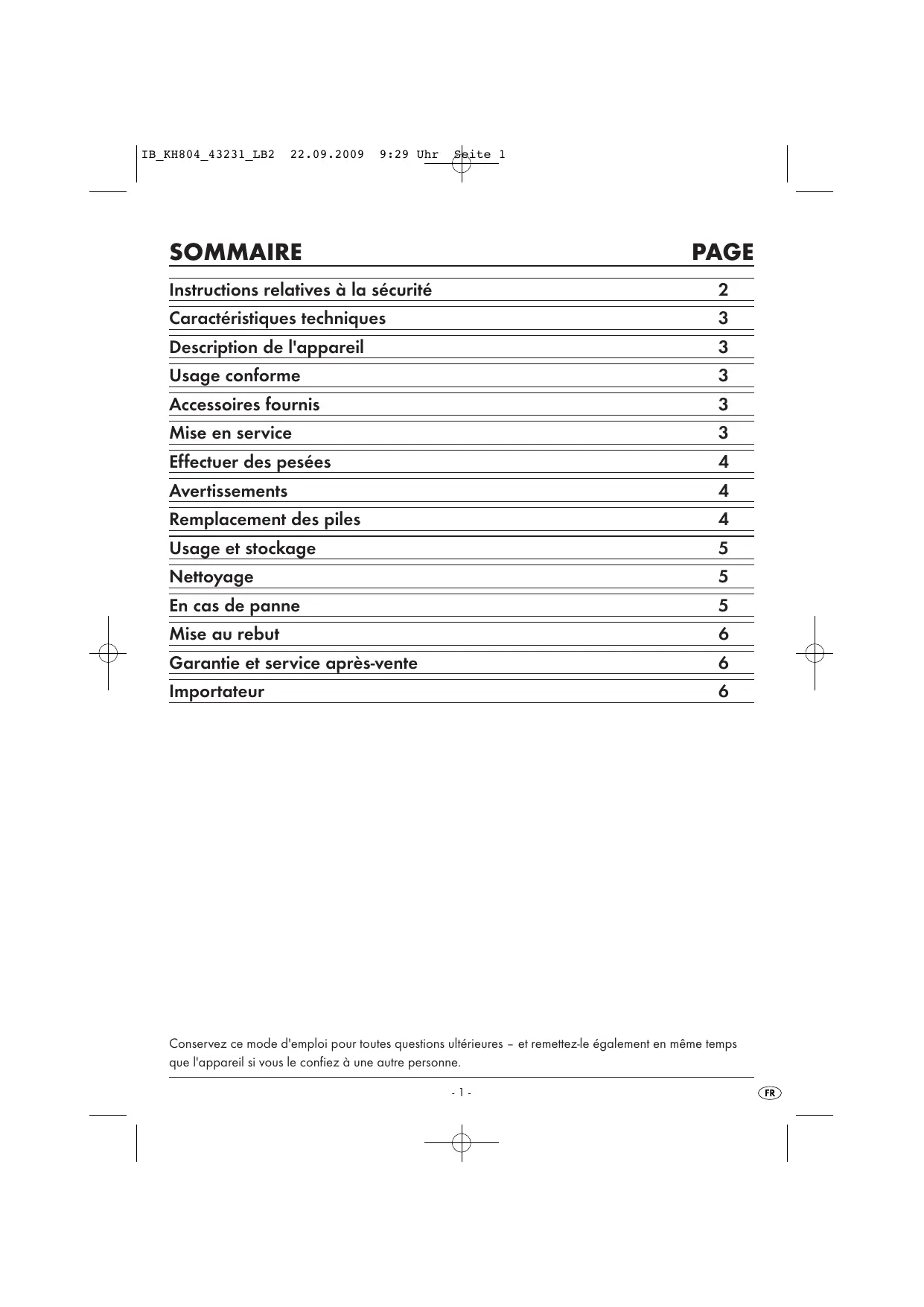 SOMMAIRE PAGE Instructions relatives à la sécurité Caractéristiques techniques Description de l'appareil Usage conforme Accessoires fournis Mise en service Effectuer des pesées Avertissements Remplacement des piles Usage et stockage Nettoyage En cas de panne Mise au rebut
