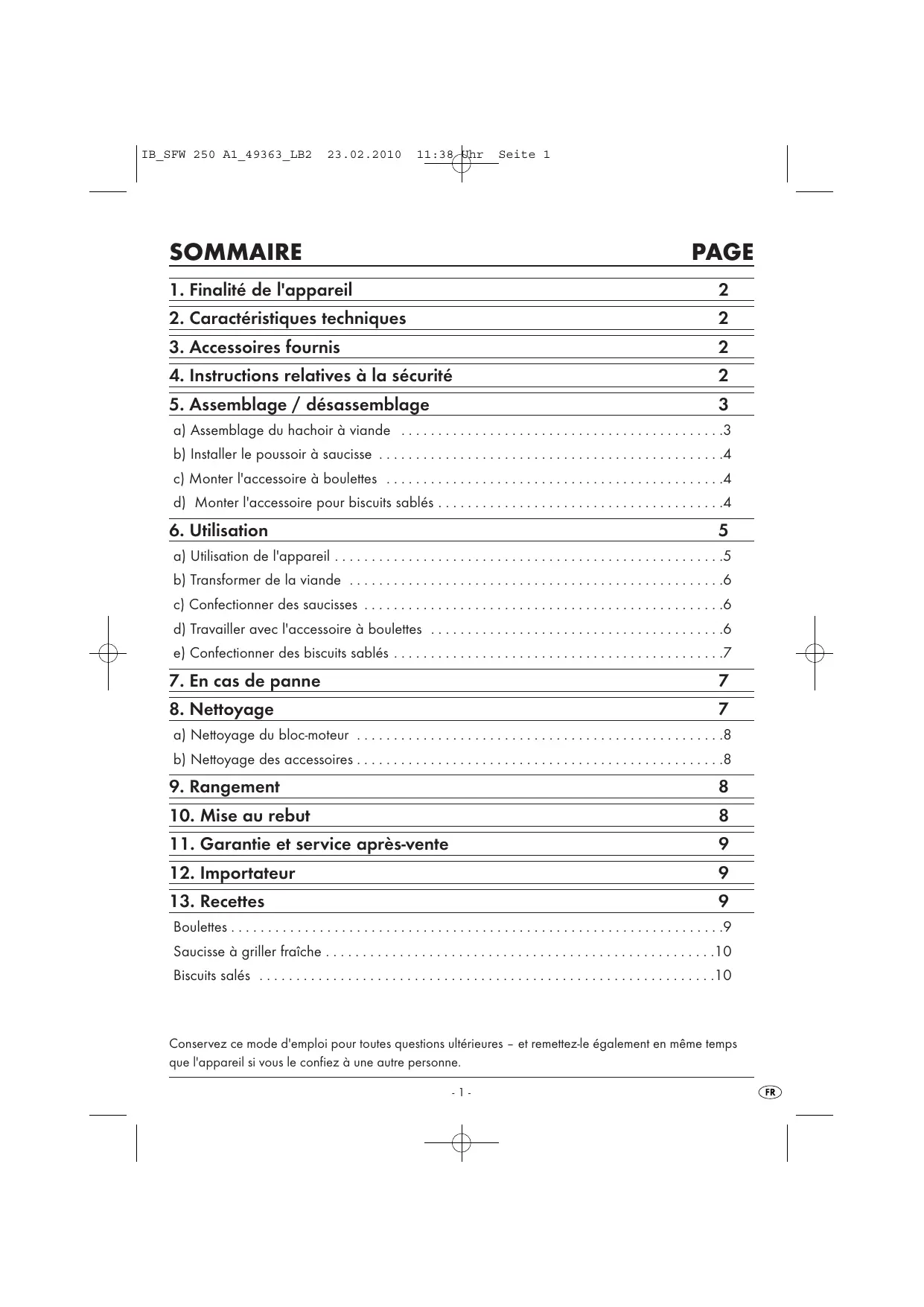 Boulettes ...........................................................222 9 Saucisse à griller fraiche .................................................... 10 Biscuits salés .......................................................... 10 Conservez ce mode d'emploi pour toutes questions ultérieures - et remettez-le également en même temps que l'appareil si vous le confiez à une autre personne. -1- (ca