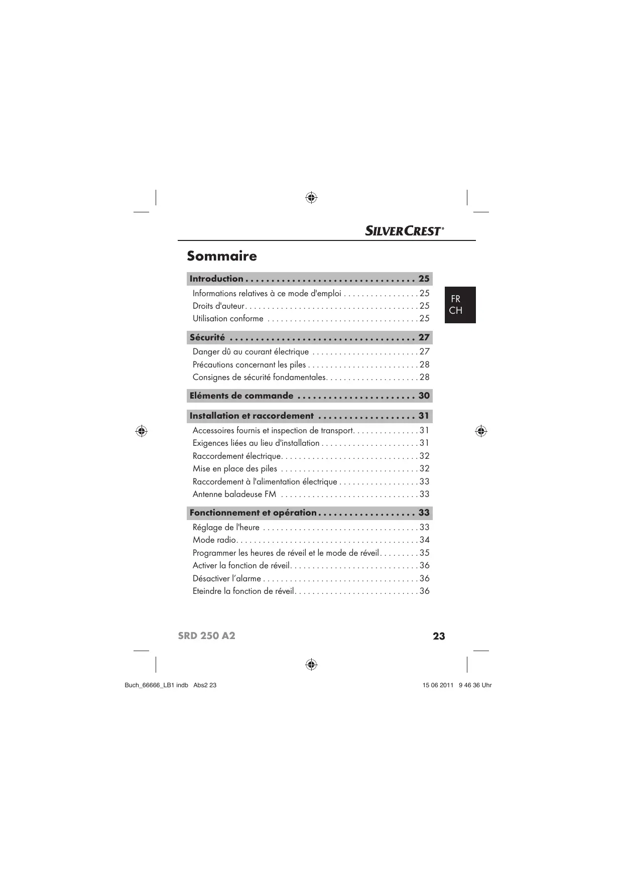 Buch_66666_LB1 indb Abs2 24 SRD 250 A2 15 06 2011 9 46 36 Uhr Introduction Introduction Informations relatives à ce mode d'emploi Ce mode d'emploi fait partie intégrante du radio réveil SRD 250 A2 (désigné ci-après par appareil) et vous donne des indications importantes sur l'usage conforme, la sécurité, le raccordement, ainsi que l'opération de l'appareil. Le mode d'emploi doit en tout temps être accessible à proximité de l'appareil. Il doit être lu et employé par chaque personne chargée de l'opération et du dépannage de l'appareil. Conservez ce mode d'emploi et remettez-le au nouveau propriétaire de l'appareil.