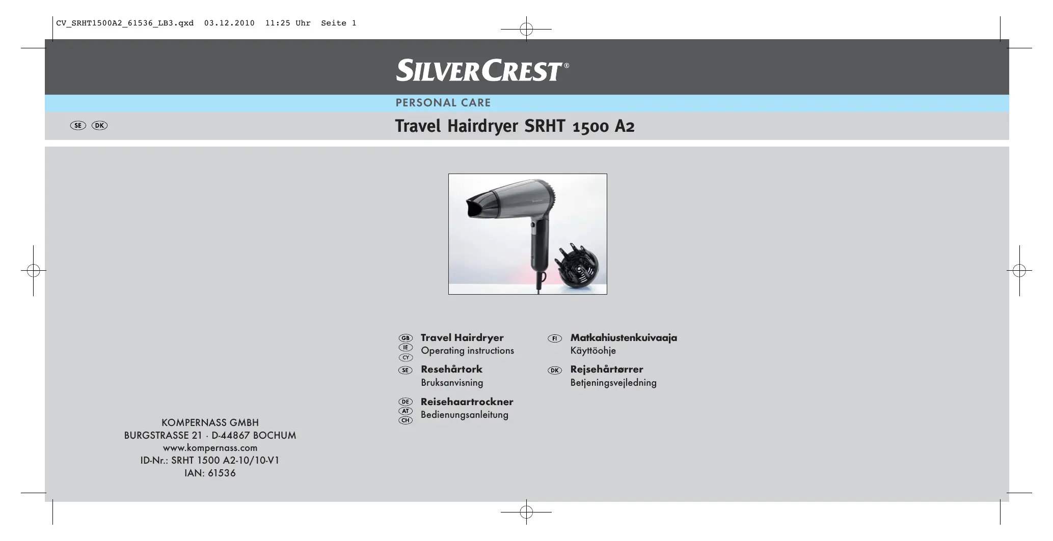 SRHT 1500 A2 TRAVEL HAIRDRYER - Sèche cheveux SILVERCREST - Notice d'utilisation et mode d'emploi gratuit
