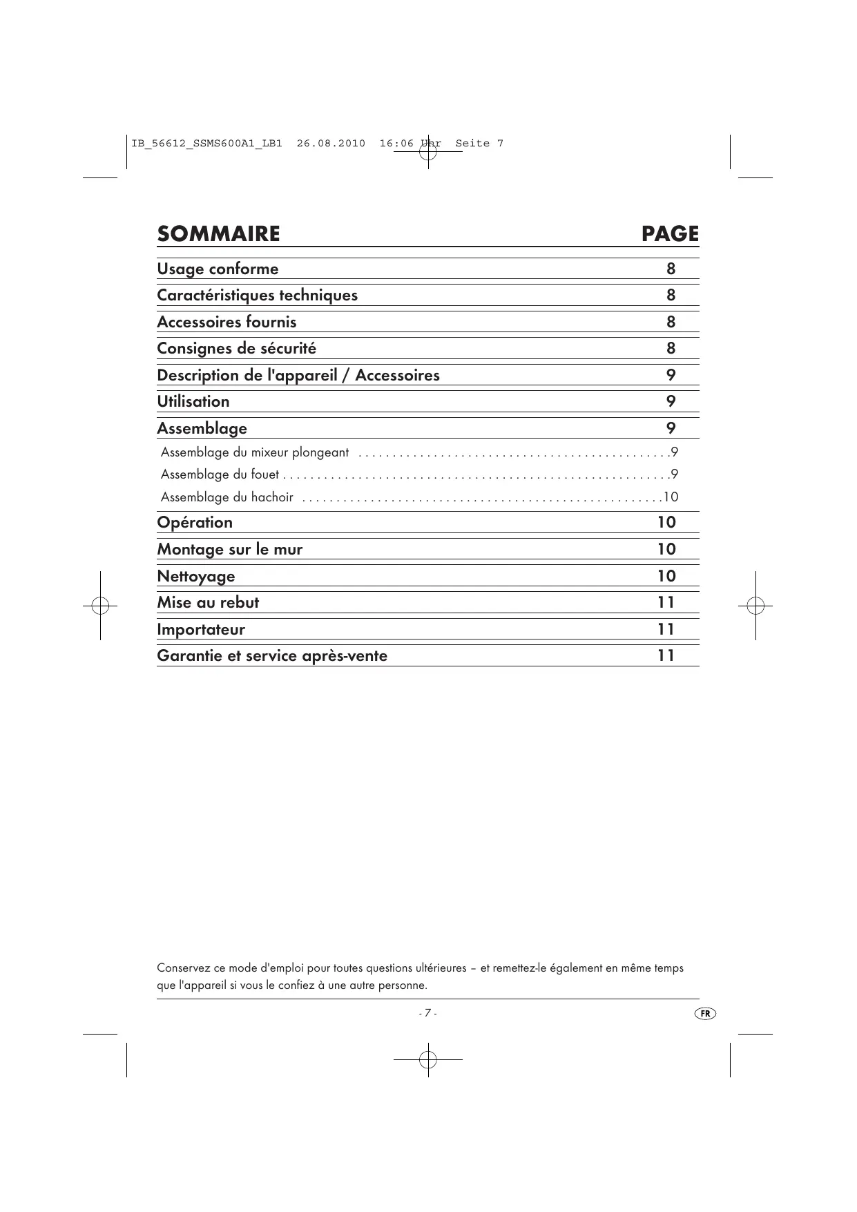 16:06 Uhr Seite 11 Importateur Risque d'accident ! Risque de blessures lors de la manipulation avec la lame extrêmement tranchante 6. Après utilisation et nettoyage, assemblez de nouveau le hachoir afin de ne pas vous blesser sur la lame libre. Tenez la lame hors de portée des enfants. KOMPERNASS GMBH BURGSTRASSE 21 44867 BOCHUM, GERMANY www.kompernass.com Attention ! Vous ne devez pas nettoyer les éléments du mixeur plongeant dans le lave-vaisselle ; ils risquent d'être endommagés. Garantie et service après-vente Débrancher la prise. Nettoyez le bloc moteur 3, le mixeur plongeant 4, le couvercle 5 et le porte-fouet 8 à l'aide d'un chiffon bien essoré. Assurez-vous qu'aucune eau ne pénètre pas dans les ouvertures du mixeur plongeant 4. En cas de taches tenaces, appliquez un produit de nettoyage doux. Nettoyez les pièces restantes à l'eau courante et séchez-les soigneusement à l'aide d'un chiffon sec. Mise au rebut L’appareil ne doit jamais être jeté dans la poubelle domestique normale. Ce produit est soumis à la directive européenne 2002/96/EC. Eliminez l’appareil par l’intermédiaire d’une entreprise de traitement des déchets autorisée ou via le service de recyclage de votre commune. Veuillez respecter les règlements actuellement en vigueur. En cas de doutes, contactez votre organisation de recyclage. Procédez à une élimination des matériaux d’emballage respectueuse de l’environnement. Cet appareil bénéficie de 3 ans de garantie à compter de la date d'achat. L'appareil a été fabriqué avec soin et consciencieusement contrôlé avant sa distribution. Veuillez conserver le ticket de caisse en guise de preuve d'achat. Si la garantie devait s'appliquer, contactez par téléphone votre interlocuteur du service après-vente. Cette condition doit être respectée pour assurer l'expédition gratuite de votre marchandise. La prestation de garantie s'applique uniquement pour les erreurs de matériaux et de fabrication, pas pour les dommages de transport, les pièces d'usure ou les dommages subis par les pièces fragiles, comme par ex. les interrupteurs ou les batteries. Le produit est exclusivement destiné à un usage privé et non commercial. La garantie est annulée en cas de manipulation incorrecte et inappropriée, d'utilisation brutale et en cas d'intervention qui n'aurait pas été réalisée par notre centre de service après-vente agréé. Cette garantie ne constitue pas une restriction de vos droits légaux. La durée de la garantie n'est pas prolongée par la garantie du fabricant. Ceci vaut également pour les pièces remplacées et réparées. Tous dommages et défauts présents dès l'achat doivent être notifiés dès que le produit est déballé, et au plus tard deux jours après la date d'achat. Toutes réparations survenant après la période sous garantie ne seront pas prises en charge.