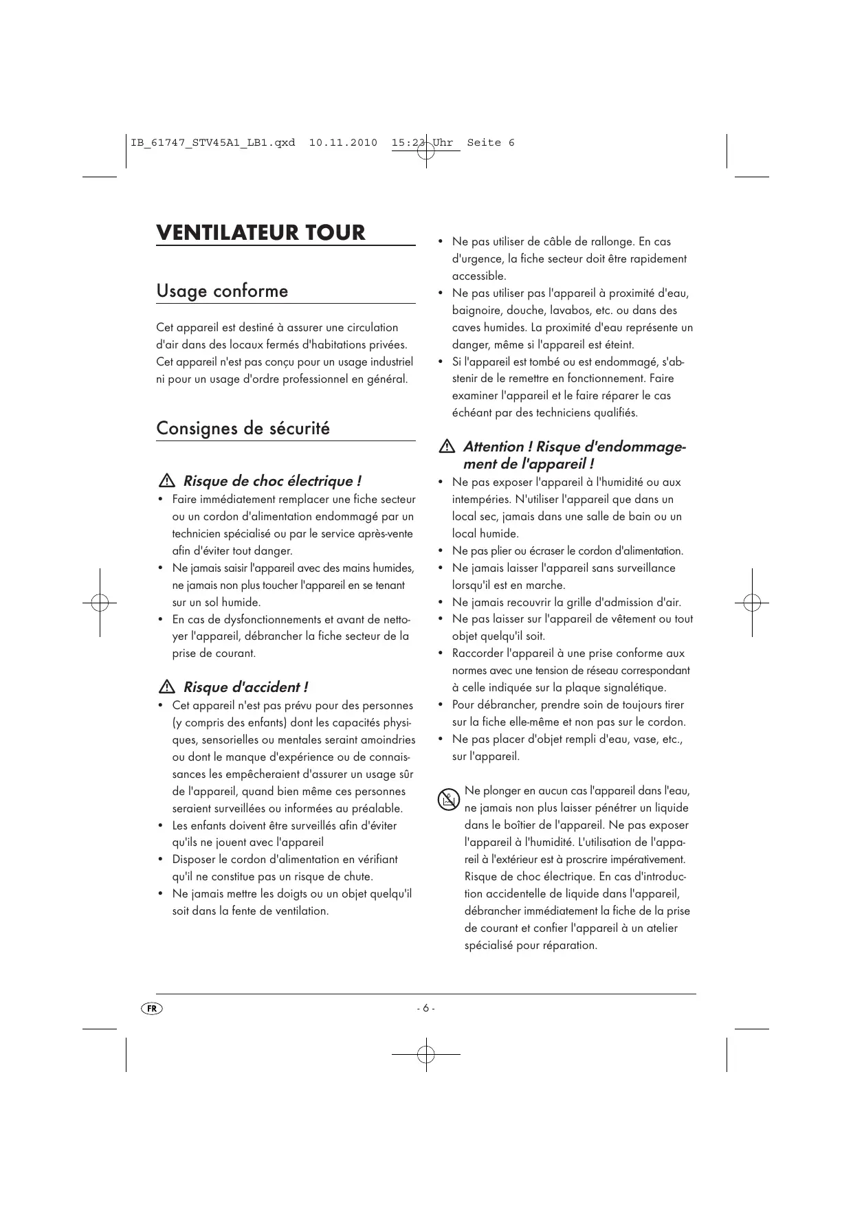 - Si l'appareil est tombé ou est endommagé, s'abstenir de le remettre en fonctionnement. Faire examiner l'appareil et le faire réparer le cas échéant par des techniciens qualifiés. Usage conforme Cet appareil est destiné à assurer une circulation d'air dans des locaux fermés d'habitations privées. Cet appareil n'est pas conçu pour un usage industriel ni pour un usage d'ordre professionnel en général. Consignes de sécurité Attention ! Risque d'endommagement de l'appareil ! Risque de choc électrique !