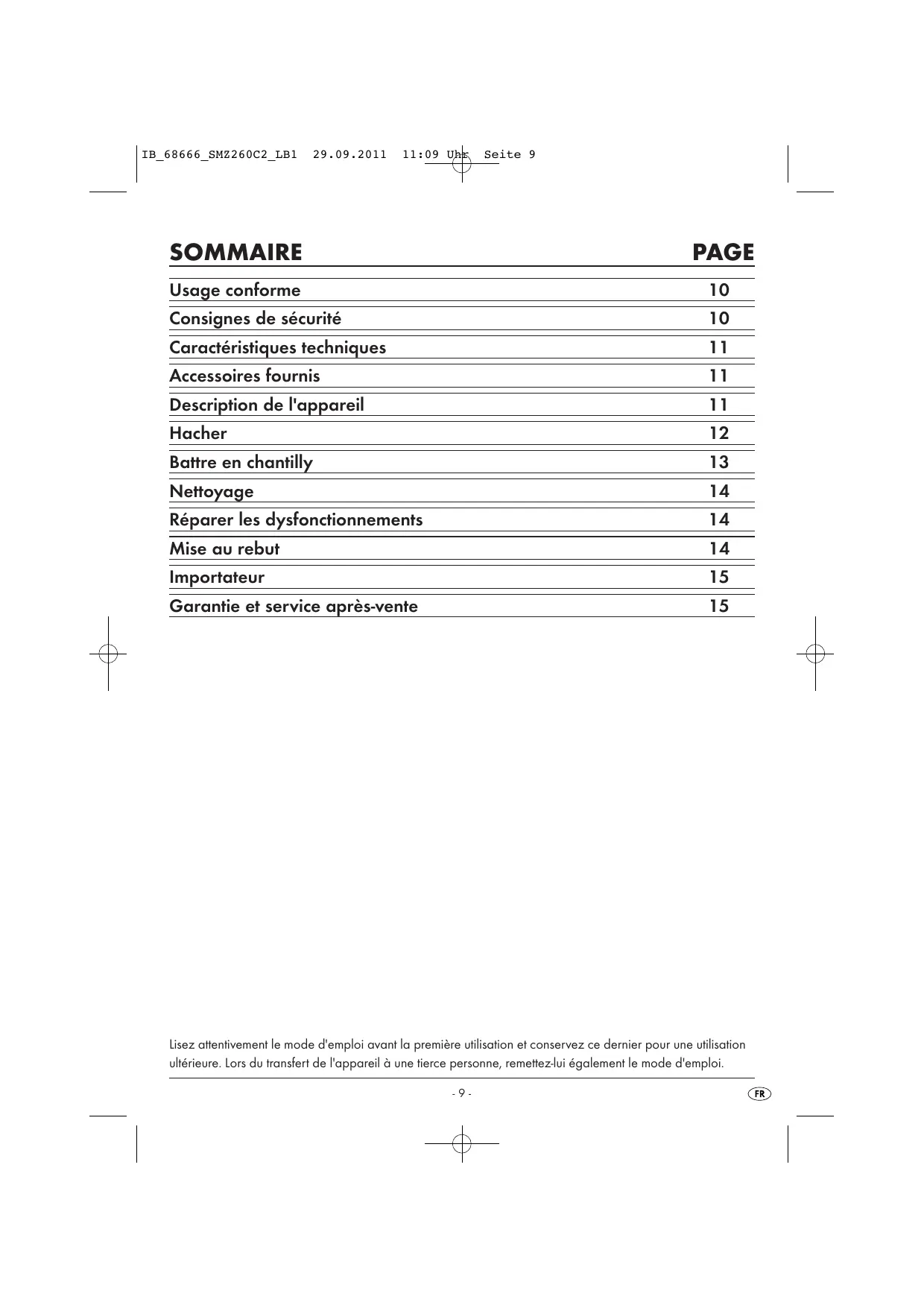 Lisez attentivement le mode d'emploi avant la première utilisation et conservez ce dernier pour une utilisation ultérieure. Lors du transfert de l'appareil à une tierce personne, remettez-lui également le mode d'emploi. -9-