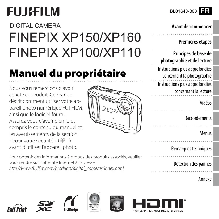 | Modèle | Appareil photo numérique FinePix XP150/XP160, XP100/XP110 |
