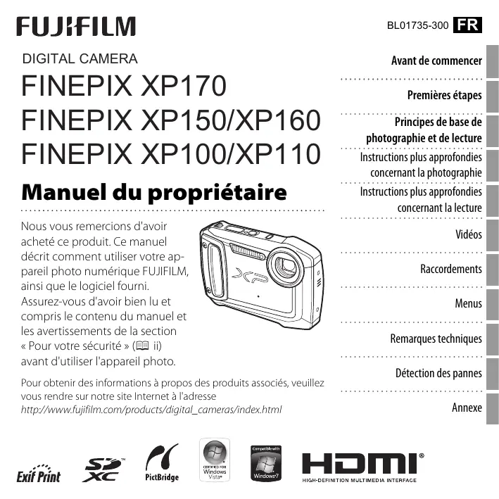Téléchargez la notice de votre Appareil photo numérique étanche au format PDF gratuitement ! Retrouvez votre notice FINEPIX XP170 - FUJIFILM et reprennez votre appareil électronique en main. Sur cette page sont publiés tous les documents nécessaires à l'utilisation de votre appareil FINEPIX XP170 de la marque FUJIFILM.