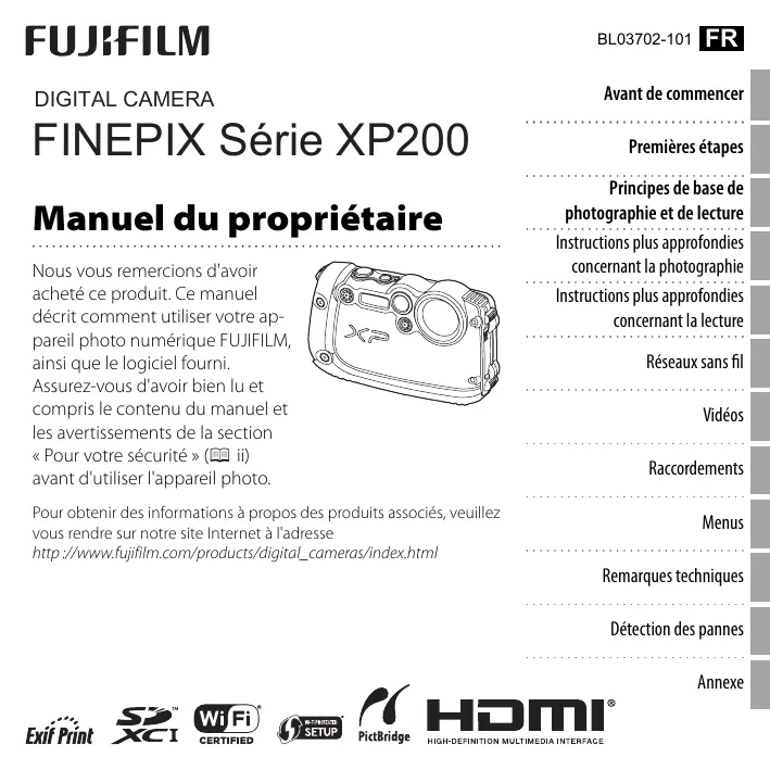 BL03702-101 DIGITAL CAMERA FINEPIX Série XP200 Manuel du propriétaire Nous vous remercions d'avoir acheté ce produit. Ce manuel décrit comment utiliser votre appareil photo numérique FUJIFILM, ainsi que le logiciel fourni. Assurez-vous d'avoir bien lu et compris le contenu du manuel et les avertissements de la section « Pour votre sécurité » (P ii) avant d'utiliser l'appareil photo. Pour obtenir des informations à propos des produits associés, veuillez vous rendre sur notre site Internet à l'adresse http ://www.fujifilm.com/products/digital_cameras/index.html