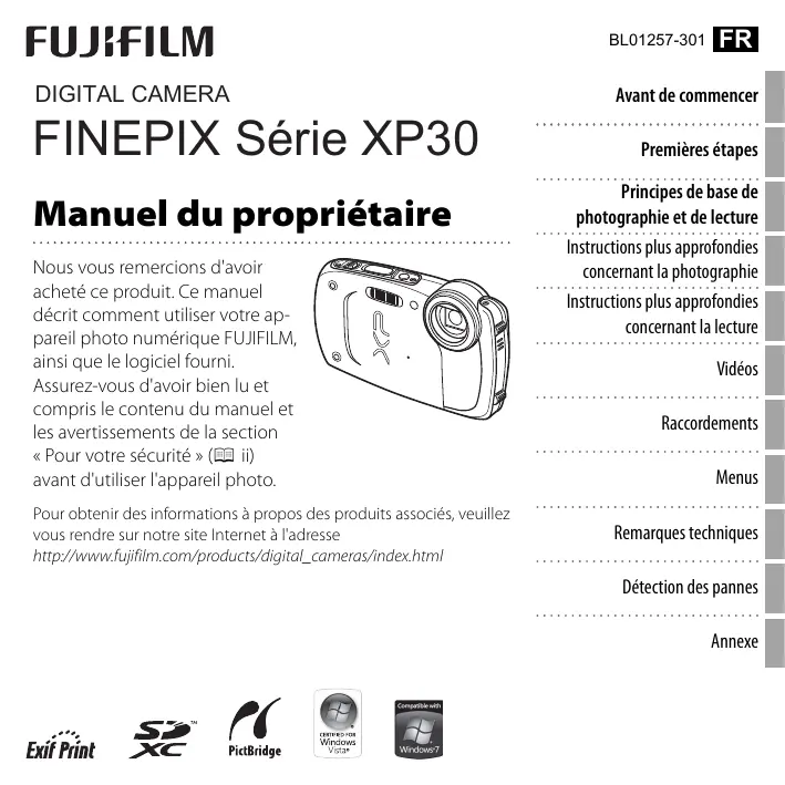 BL01257-301 DIGITAL CAMERA FINEPIX Série XP30 Manuel du propriétaire Nous vous remercions d'avoir acheté ce produit. Ce manuel décrit comment utiliser votre appareil photo numérique FUJIFILM, ainsi que le logiciel fourni. Assurez-vous d'avoir bien lu et compris le contenu du manuel et les avertissements de la section « Pour votre sécurité » (P ii) avant d'utiliser l'appareil photo. Pour obtenir des informations à propos des produits associés, veuillez vous rendre sur notre site Internet à l'adresse http://www.fujifilm.com/products/digital_cameras/index.html
