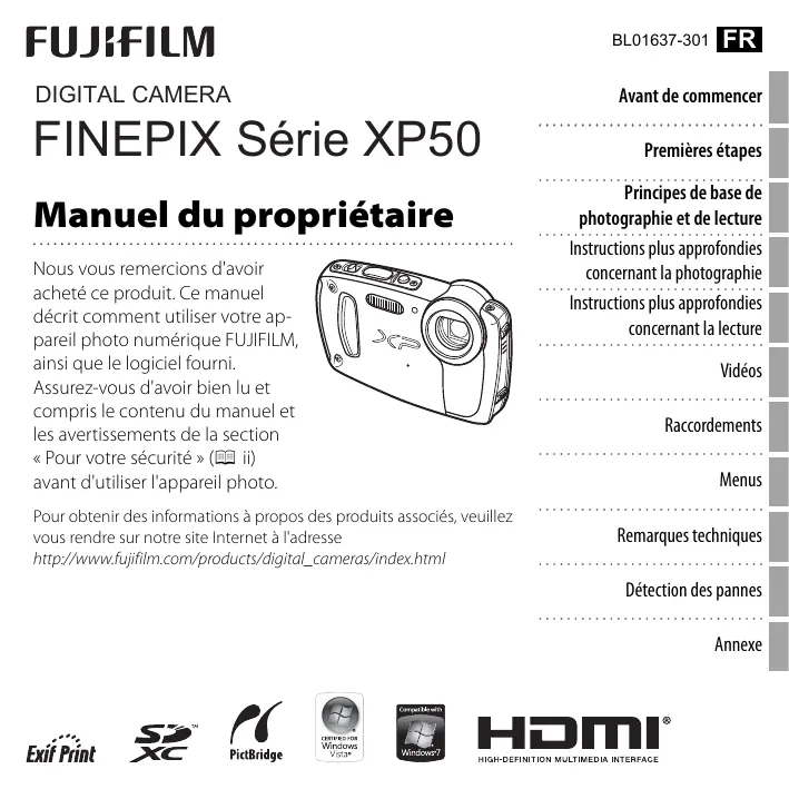 Retrouvez gratuitement la notice de l'appareil FINEPIX XP50 FUJIFILM au format PDF.