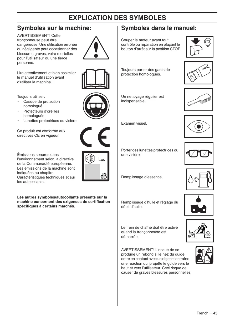 - Lunettes protectrices ou visière Symboles dans le manuel: Couper le moteur avant tout contrôle ou réparation en plaçant le bouton d’arrêt sur la position STOP. Toujours porter des gants de protection homologués. Un nettoyage régulier est indispensable. Examen visuel. Ce produit est conforme aux directives CE en vigueur. Émissions sonores dans l’environnement selon la directive de la Communauté européenne. Les émissions de la machine sont indiquées au chapitre Caractéristiques techniques et sur les autocollants. Les autres symboles/autocollants présents sur la machine concernent des exigences de certification spécifiques à certains marchés. Porter des lunettes protectrices ou une visière. Remplissage d’essence. Remplissage d’huile et réglage du débit d’huile. Le frein de chaîne doit être activé quand la tronçonneuse est démarrée. AVERTISSEMENT! Il risque de se produire un rebond si le nez du guide entre en contact avec un objet et entraîne une réaction qui projette le guide vers le haut et vers l’utilisateur. Ceci risque de causer de graves blessures personnelles. French – 45 SOMMAIRE Sommaire