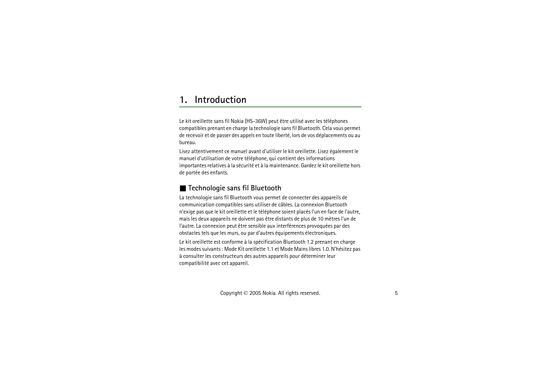 Le kit oreillette sans fil Nokia (HS-36W) peut être utilisé avec les téléphones compatibles prénant en charge la technologie sans fil Bluetooth. Cela vous permet de receivevoir et de passer des appeals en toute liberté, lors de vos déplacements ou au bureau.