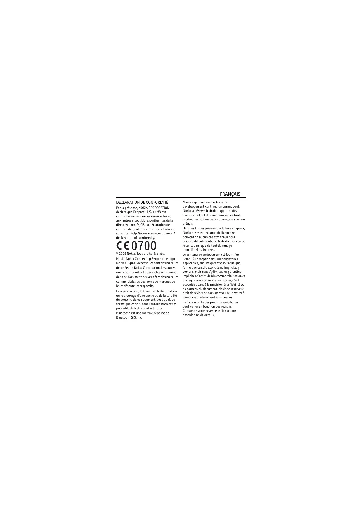 Par la presente, NOKIA CORPORATION declare que l'appareil HS-127W est conforme aux exigences essentielles et aux autres dispositions pertinentes de la directive 1999/5/CE. La déclaration de conformité peut être consultée à l'adresse suivante: http://www.nokia.com/phones/declaration_of_conformity/.