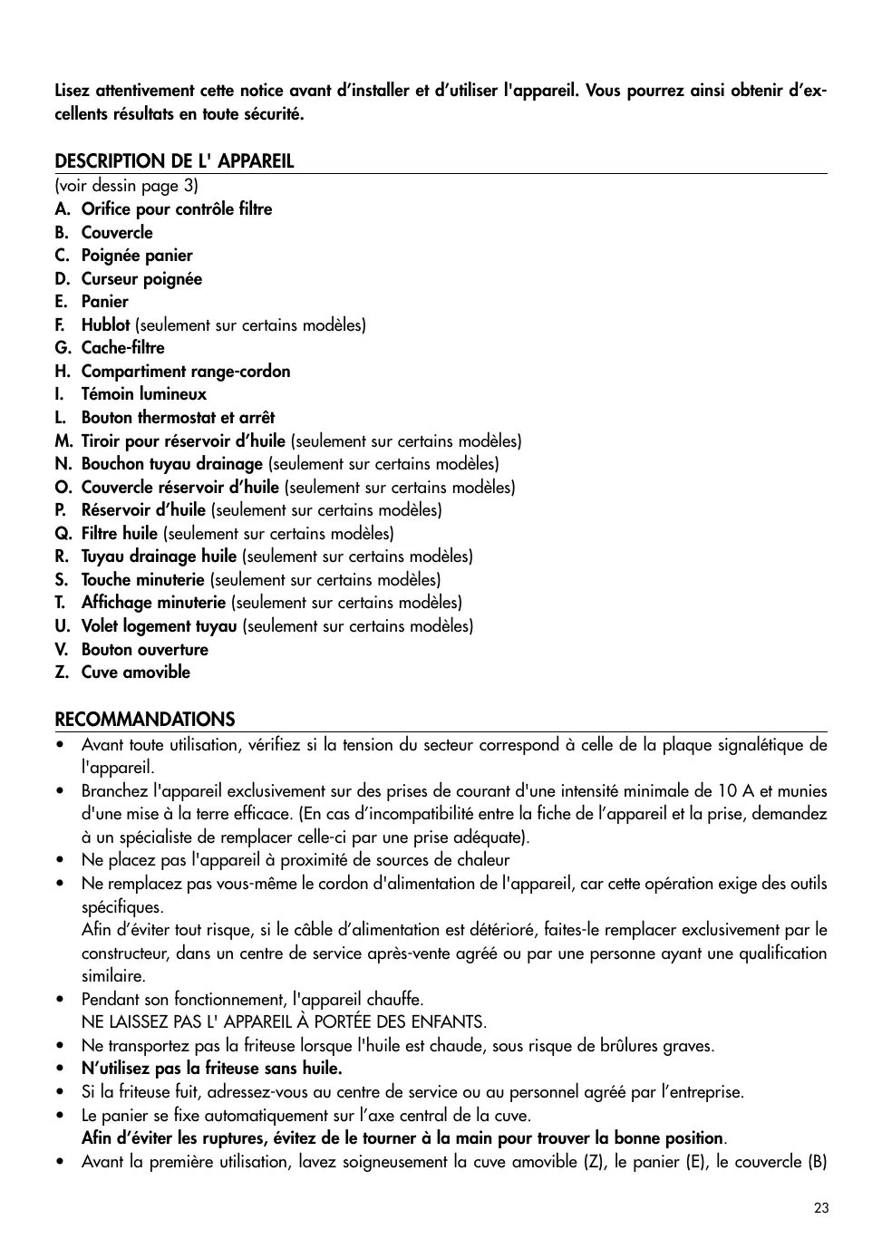 (après avoir retiré les filtres) et l’ensemble protège-huile (O, P et Q) à l’eau chaude + produit vaisselle. Pour vider l’eau, utilisez toujours le tuyau de drainage de l’huile (s’il est prévu) (voir fig. 14). L’opération étant terminée, essuyez le tout soigneusement ainsi que l’éventuel résidu d’eau au fond de la cuve et surtout dans le tuyau de drainage de l’huile. Cela évitera les éclaboussures dangereuses d’huile chaude pendant le fonctionnement Pendant le fonctionnement, le tuyau d’évacuation doit rester fermé et rangé dans son compartiment. L'utilisation de cet appareil par des enfants ou des personnes incapables ne devrait pas être autorisée sans surveillance. Ne laissez pas les enfants jouer avec l’appareil. Ne déplacez pas l’appareil lorsque l'huile est encore chaude. Pour déplacer l’appareil, utilisez les poignées prévues. (N’utilisez jamais la poignée du panier pour cela) Il est parfaitement normal que lors de la première utilisation l’appareil dégage une odeur de neuf. Aérez la pièce. Les matières et les objets destinés au contact avec des produits alimentaires sont conformes à la directive CEE 89/109. La cuve amovible (Z) doit être extraite et insérée avec soin, en suivant l’inclinaison du logement. Avant d’exécuter cette opération, attendez que l’huile et l’appareil aient refroidi. Une fois que la cuve est insérée dans son logement, assurez-vous qu’elle est bien positionnée pour ne pas l’abîmer quand vous refermez le couvercle (B).