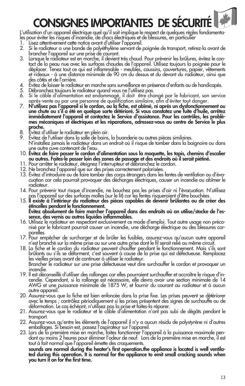 emballages. Si besoin est, passez l’aspirateur sur l’appareil. 23. Lors de la première mise en marche, faites fonctionner l’appareil à la puissance maximale pendant au moins 2 heures pour éliminer l’odeur de neuf. Lors de la première mise en marche, il est tout à fait normal que l’appareil émette des craquements. sounds are normal during the heater’s first operation.the appliance is located is well ventilated during this operation. It is normal for the appliance to emit small cracking sounds when you turn it on for the first time.