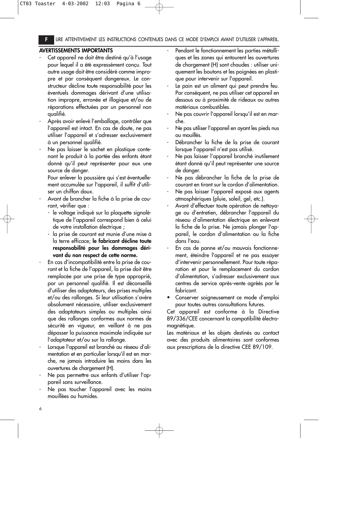- Conserver soigneusement ce mode d’emploi pour toutes autres consultations futures. Cet appareil est conforme à la Directive 89/336/CEE concernant la compatibilité électromagnétique. Les matériaux et les objets destinés au contact avec des produits alimentaires sont conformes aux prescriptions de la directive CEE 89/109. CT03 Toaster 4-03-2002 DESCRIPTION 12:03
