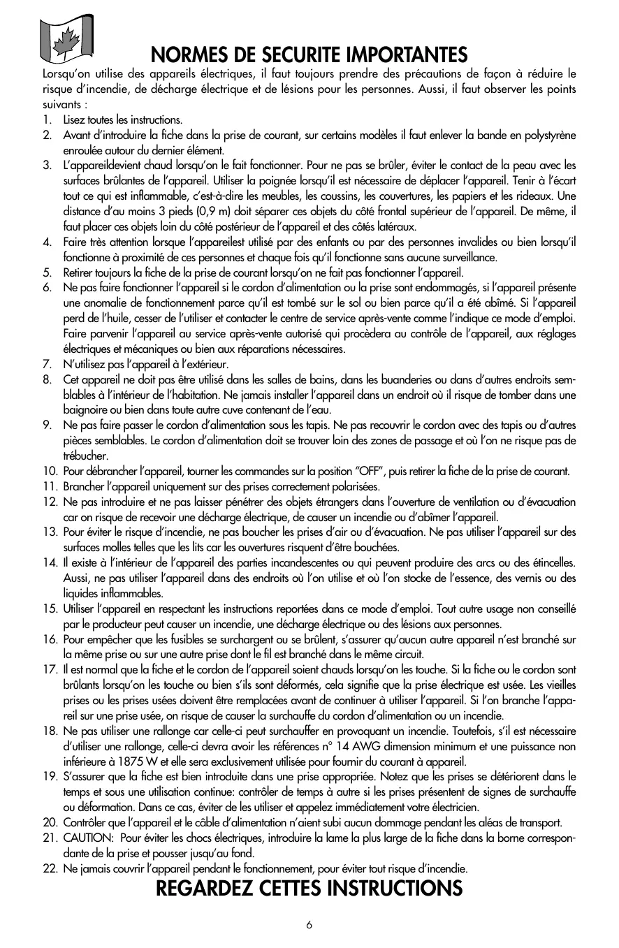 1. Lisez toutes les instructions. 2. Avant d’introduire la fiche dans la prise de courant, sur certains modèles il faut enlever la bande en polystyrène enroulée autour du dernier élément. 3. L’appareildevient chaud lorsqu’on le fait fonctionner. Pour ne pas se brûler, éviter le contact de la peau avec les surfaces brûlantes de l’appareil. Utiliser la poignée lorsqu’il est nécessaire de déplacer l’appareil. Tenir à l’écart tout ce qui est inflammable, c’est-à-dire les meubles, les coussins, les couvertures, les papiers et les rideaux. Une distance d’au moins 3 pieds (0,9 m) doit séparer ces objets du côté frontal supérieur de l’appareil. De même, il faut placer ces objets loin du côté postérieur de l’appareil et des côtés latéraux. 4. Faire très attention lorsque l’appareilest utilisé par des enfants ou par des personnes invalides ou bien lorsqu’il fonctionne à proximité de ces personnes et chaque fois qu’il fonctionne sans aucune surveillance. 5. Retirer toujours la fiche de la prise de courant lorsqu’on ne fait pas fonctionner l’appareil. 6. Ne pas faire fonctionner l’appareil si le cordon d’alimentation ou la prise sont endommagés, si l’appareil présente une anomalie de fonctionnement parce qu’il est tombé sur le sol ou bien parce qu’il a été abîmé. Si l’appareil perd de l’huile, cesser de l’utiliser et contacter le centre de service après-vente comme l’indique ce mode d’emploi. Faire parvenir l’appareil au service après-vente autorisé qui procèdera au contrôle de l’appareil, aux réglages électriques et mécaniques ou bien aux réparations nécessaires. 7. N’utilisez pas l’appareil à l’extérieur. 8. Cet appareil ne doit pas être utilisé dans les salles de bains, dans les buanderies ou dans d’autres endroits semblables à l’intérieur de l’habitation. Ne jamais installer l’appareil dans un endroit où il risque de tomber dans une baignoire ou bien dans toute autre cuve contenant de l’eau. 9. Ne pas faire passer le cordon d’alimentation sous les tapis. Ne pas recouvrir le cordon avec des tapis ou d’autres pièces semblables. Le cordon d’alimentation doit se trouver loin des zones de passage et où l’on ne risque pas de trébucher. 10. Pour débrancher l’appareil, tourner les commandes sur la position “OFF”, puis retirer la fiche de la prise de courant. 11. Brancher l’appareil uniquement sur des prises correctement polarisées. 12. Ne pas introduire et ne pas laisser pénétrer des objets étrangers dans l’ouverture de ventilation ou d’évacuation car on risque de recevoir une décharge électrique, de causer un incendie ou d’abîmer l’appareil. 13. Pour éviter le risque d’incendie, ne pas boucher les prises d’air ou d’évacuation. Ne pas utiliser l’appareil sur des surfaces molles telles que les lits car les ouvertures risquent d’être bouchées. 14. Il existe à l’intérieur de l’appareil des parties incandescentes ou qui peuvent produire des arcs ou des étincelles. Aussi, ne pas utiliser l’appareil dans des endroits où l’on utilise et où l’on stocke de l’essence, des vernis ou des liquides inflammables. 15. Utiliser l’appareil en respectant les instructions reportées dans ce mode d’emploi. Tout autre usage non conseillé par le producteur peut causer un incendie, une décharge électrique ou des lésions aux personnes. 16. Pour empêcher que les fusibles se surchargent ou se brûlent, s’assurer qu’aucun autre appareil n’est branché sur la même prise ou sur une autre prise dont le fil est branché dans le même circuit. 17. Il est normal que la fiche et le cordon de l’appareil soient chauds lorsqu’on les touche. Si la fiche ou le cordon sont brûlants lorsqu’on les touche ou bien s’ils sont déformés, cela signifie que la prise électrique est usée. Les vieilles prises ou les prises usées doivent être remplacées avant de continuer à utiliser l’appareil. Si l’on branche l’appareil sur une prise usée, on risque de causer la surchauffe du cordon d’alimentation ou un incendie. 18. Ne pas utiliser une rallonge car celle-ci peut surchauffer en provoquant un incendie. Toutefois, s’il est nécessaire d’utiliser une rallonge, celle-ci devra avoir les références n° 14 AWG dimension minimum et une puissance non inférieure à 1875 W et elle sera exclusivement utilisée pour fournir du courant à appareil. 19. S’assurer que la fiche est bien introduite dans une prise appropriée. Notez que les prises se détériorent dans le temps et sous une utilisation continue: contrôler de temps à autre si les prises présentent de signes de surchauffe ou déformation. Dans ce cas, éviter de les utiliser et appelez immédiatement votre électricien. 20. Contrôler que l’appareil et le câble d’alimentation n’aient subi aucun dommage pendant les aléas de transport. 21. CAUTION: Pour éviter les chocs électriques, introduire la lame la plus large de la fiche dans la borne correspondante de la prise et pousser jusqu’au fond. 22. Ne jamais couvrir l’appareil pendant le fonctionnement, pour éviter tout risque d’incendie.