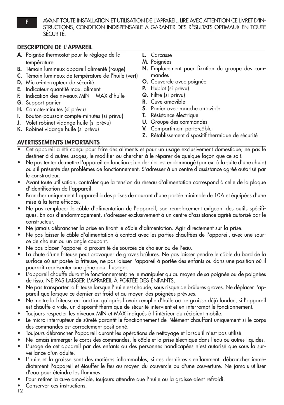 • Avant toute utilisation, contrôler que la tension du réseau d'alimentation correspond à celle de la plaque d'identification de l'appareil. • Brancher uniquement l'appareil à des prises de courant d'une portée minimale de 10A et équipées d'une mise à la terre efficace. • Ne pas remplacer le câble d'alimentation de l'appareil, son remplacement exigeant des outils spécifiques. En cas d'endommagement, s'adresser exclusivement à un centre d'assistance agréé autorisé par le constructeur. • Ne jamais débrancher la prise en tirant le câble d'alimentation. Agir directement sur la prise. • Ne pas laisser le câble d'alimentation à contact avec les parties chauffées de l'appareil, avec une source de chaleur ou un angle coupant. • Ne pas placer l'appareil à proximité de sources de chaleur ou de l'eau. • La chute d'une friteuse peut provoquer de graves brûlures. Ne pas laisser pendre le câble du bord de la surface où est posée la friteuse, ne pas laisser l'appareil à portée des enfants ou dans une position où il pourrait représenter une gêne pour l'usager. • L'appareil chauffe durant le fonctionnement; ne le manipuler qu'au moyen de sa poignée ou de poignées de tissu. NE PAS LAISSER L'APPAREIL À PORTÉE DES ENFANTS. • Ne pas transporter la friteuse lorsque l'huile est chaude, sous risque de brûlures graves. Ne déplacer l'appareil que lorsque ce dernier est froid et au moyen des poignées prévues. • Ne mettre la friteuse en fonction qu'après l'avoir remplie d'huile ou de graisse déjà fondue; si l'appareil est chauffé à vide, un dispositif thermique de sécurité intervient et en interrompt le fonctionnement. • Toujours respecter les niveaux MIN et MAX indiqués à l'intérieur du récipient mobile. • Le micro-interrupteur de sûreté garantit le fonctionnement de l'élément chauffant uniquement si le corps des commandes est correctement positionné. • Toujours débrancher l'appareil durant les opérations de nettoyage et lorsqu'il n'est pas utilisé. • Ne jamais immerger le corps des commandes, le câble et la prise électrique dans l'eau ou autres liquides. • L'usage de cet appareil par des enfants ou des personnes handicapées n'est autorisé que sous la surveillance d'un adulte. • L'huile et la graisse sont des matières inflammables; si ces dernières s'enflamment, débrancher immédiatement l'appareil et étouffer le feu au moyen du couvercle ou d'une couverture. Ne jamais utiliser d'eau pour éteindre les flammes. • Pour retirer la cuve amovible, toujours attendre que l'huile ou la graisse aient refroidi. • Conserver ces instructions. 12