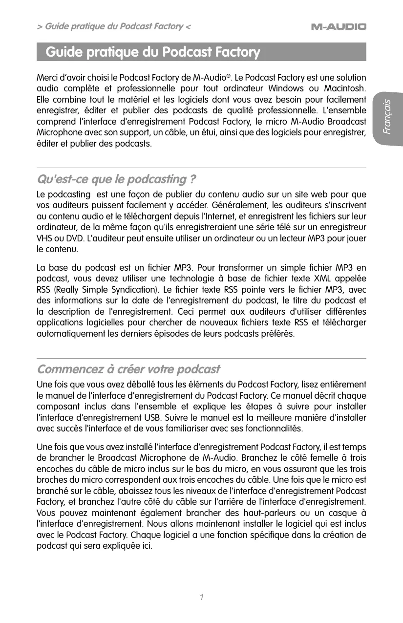 Nederlands Guide pratique duNederlands Podcast Factory > Guide pratique du Podcast Factory < Merci d’avoir choisi le Podcast Factory de M-Audio®. Le Podcast Factory est une solution audio complète et professionnelle pour tout ordinateur Windows ou Macintosh. Elle combine tout le matériel et les logiciels dont vous avez besoin pour facilement enregistrer, éditer et publier des podcasts de qualité professionnelle. L'ensemble comprend l'interface d'enregistrement Podcast Factory, le micro M-Audio Broadcast Microphone avec son support, un câble, un étui, ainsi que des logiciels pour enregistrer, éditer et publier des podcasts. Qu'est-ce que le podcasting ? Le podcasting est une façon de publier du contenu audio sur un site web pour que vos auditeurs puissent facilement y accéder. Généralement, les auditeurs s'inscrivent au contenu audio et le téléchargent depuis l'Internet, et enregistrent les fichiers sur leur ordinateur, de la même façon qu'ils enregistreraient une série télé sur un enregistreur VHS ou DVD. L'auditeur peut ensuite utiliser un ordinateur ou un lecteur MP3 pour jouer le contenu. La base du podcast est un fichier MP3. Pour transformer un simple fichier MP3 en podcast, vous devez utiliser une technologie à base de fichier texte XML appelée RSS (Really Simple Syndication). Le fichier texte RSS pointe vers le fichier MP3, avec des informations sur la date de l'enregistrement du podcast, le titre du podcast et la description de l'enregistrement. Ceci permet aux auditeurs d'utiliser différentes applications logicielles pour chercher de nouveaux fichiers texte RSS et télécharger automatiquement les derniers épisodes de leurs podcasts préférés. Commencez à créer votre podcast Une fois que vous avez déballé tous les éléments du Podcast Factory, lisez entièrement le manuel de l'interface d'enregistrement du Podcast Factory. Ce manuel décrit chaque composant inclus dans l'ensemble et explique les étapes à suivre pour installer l'interface d'enregistrement USB. Suivre le manuel est la meilleure manière d'installer avec succès l'interface et de vous familiariser avec ses fonctionnalités. Une fois que vous avez installé l'interface d'enregistrement Podcast Factory, il est temps de brancher le Broadcast Microphone de M-Audio. Branchez le côté femelle à trois encoches du câble de micro inclus sur le bas du micro, en vous assurant que les trois broches du micro correspondent aux trois encoches du câble. Une fois que le micro est branché sur le câble, abaissez tous les niveaux de l'interface d'enregistrement Podcast Factory, et branchez l'autre côté du câble sur l'arrière de l'interface d'enregistrement. Vous pouvez maintenant également brancher des haut-parleurs ou un casque à l'interface d'enregistrement. Nous allons maintenant installer le logiciel qui est inclus avec le Podcast Factory. Chaque logiciel a une fonction spécifique dans la création de podcast qui sera expliquée ici.