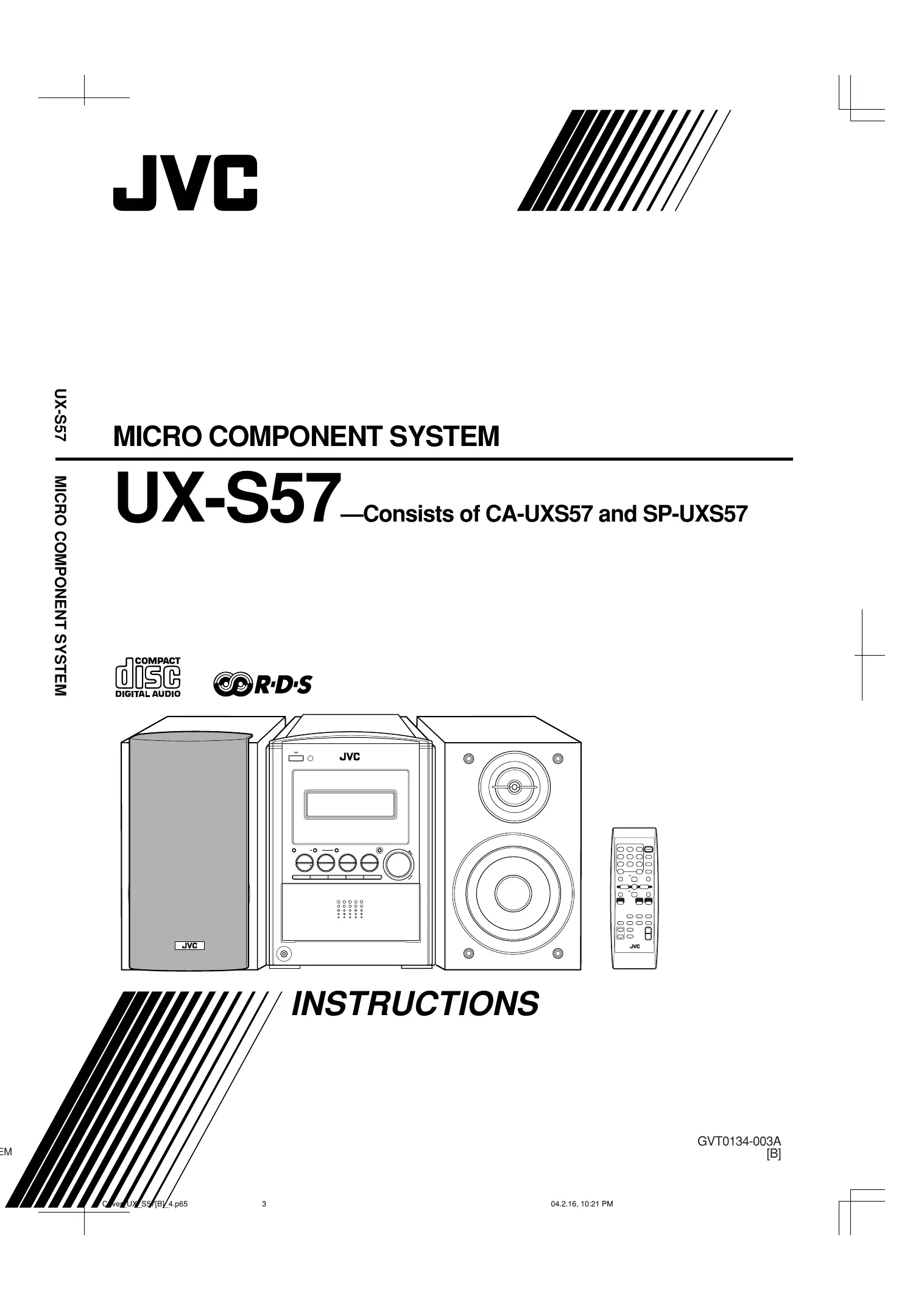 Téléchargez la notice de votre Système audio compact au format PDF gratuitement ! Retrouvez votre notice UX-S57 - JVC et reprennez votre appareil électronique en main. Sur cette page sont publiés tous les documents nécessaires à l'utilisation de votre appareil UX-S57 de la marque JVC.