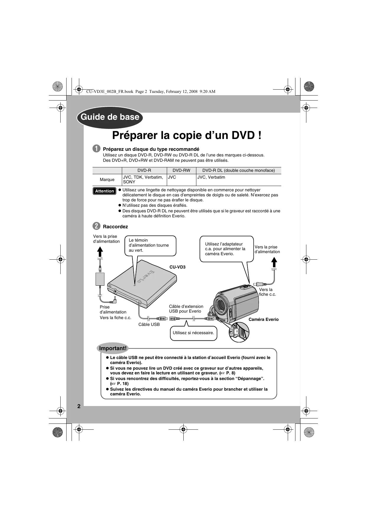 Raccordez Vers la prise d’alimentation Le témoin d’alimentation tourne au vert. Utilisez l’adaptateur c.a. pour alimenter la caméra Everio. Vers la prise d’alimentation CU-VD3 Vers la fiche c.c. Câble d’extension USB pour Everio Prise d’alimentation Vers la fiche c.c. Caméra Everio Câble USB Utilisez si nécessaire. Important! z Le câble USB ne peut être connecté à la station d’accueil Everio (fourni avec le caméra Everio). z Si vous ne pouvez lire un DVD créé avec ce graveur sur d’autres appareils, vous devez en faire la lecture en utilisant ce graveur. (A P. 8) z Si vous rencontrez des difficultés, reportez-vous à la section “Dépannage”. (A P. 18) z Suivez les directives du manuel du caméra Everio pour brancher et utiliser la caméra Everio.