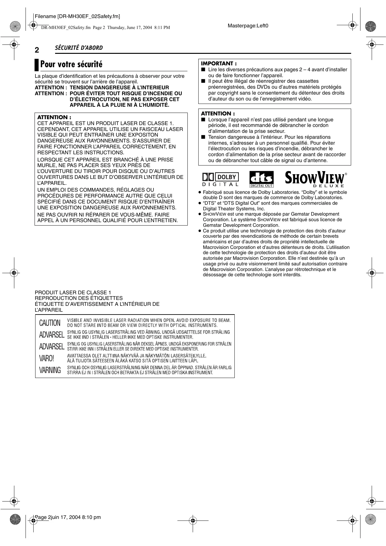 ÉTIQUETTE D’AVERTISSEMENT A L’INTÉRIEUR DE L’APPAREIL Page 2juin 17, 2004 8:10 pm IMPORTANT : 8 Lire les diverses précautions aux pages 2 – 4 avant d’installer ou de faire fonctionner l’appareil. 8 Il peut être illégal de réenregistrer des cassettes préenregistrées, des DVDs ou d’autres matériels protégés par copyright sans le consentement du détenteur des droits d’auteur du son ou de l’enregistrement vidéo. ATTENTION : 8 Lorsque l’appareil n’est pas utilisé pendant une longue période, il est recommandé de débrancher le cordon d’alimentation de la prise secteur. 8 Tension dangereuse à l’intérieur. Pour les réparations internes, s’adresser à un personnel qualifié. Pour éviter l’électrocution ou les risques d’incendie, débrancher le cordon d’alimentation de la prise secteur avant de raccorder ou de débrancher tout câble de signal ou d’antenne. ● Fabriqué sous licence de Dolby Laboratories. “Dolby” et le symbole double D sont des marques de commerce de Dolby Laboratories. ● “DTS” et “DTS Digital Out” sont des marques commerciales de Digital Theater Systems, Inc. ● SHOWVIEW est une marque déposée par Gemstar Development Corporation. Le système SHOWVIEW est fabriqué sous licence de Gemstar Development Corporation. ● Ce produit utilise une technologie de protection des droits d’auteur couverte par des revendications de méthode de certain brevets américains et par d’autres droits de propriété intellectuelle de Macrovision Corporation et d’autres détenteurs de droits. L’utilisation de cette technologie de protection des droits d’auteur doit être autorisée par Macrovision Corporation. Elle n’est destinée qu’à un usage privé ou autre visionnement limité sauf autorisation contraire de Macrovision Corporation. L’analyse par rétrotechnique et le désossage de cette technologie sont interdits. Filename [DR-MH30EF_02Safety.fm] DR-MH30EF_00.book Page 3 Thursday, June 17, 2004 2:05 PM Masterpage:Right+