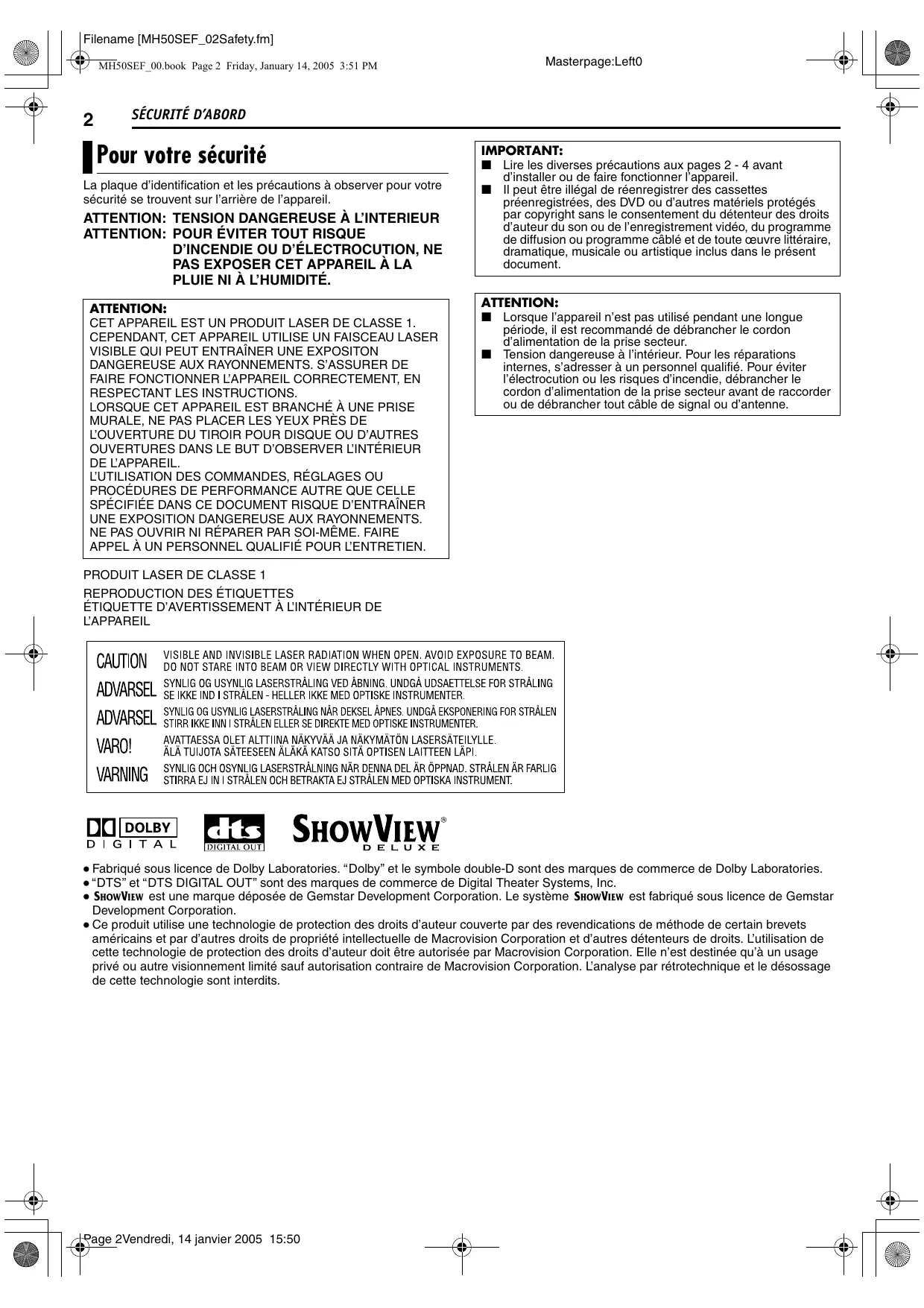 ÉTIQUETTE D’AVERTISSEMENT À L’INTÉRIEUR DE L’APPAREIL ● Fabriqué sous licence de Dolby Laboratories. ADolbyB et le symbole double-D sont des marques de commerce de Dolby Laboratories. ● ADTSB et ADTS DIGITAL OUTB sont des marques de commerce de Digital Theater Systems, Inc. ● a est une marque déposée de Gemstar Development Corporation. Le système a est fabriqué sous licence de Gemstar Development Corporation. ● Ce produit utilise une technologie de protection des droits d’auteur couverte par des revendications de méthode de certain brevets américains et par d’autres droits de propriété intellectuelle de Macrovision Corporation et d’autres détenteurs de droits. L’utilisation de cette technologie de protection des droits d’auteur doit être autorisée par Macrovision Corporation. Elle n’est destinée qu’à un usage privé ou autre visionnement limité sauf autorisation contraire de Macrovision Corporation. L’analyse par rétrotechnique et le désossage de cette technologie sont interdits. Page 2Vendredi, 14 janvier 2005 15:50 Filename [MH50SEF_02Safety.fm] MH50SEF_00.book Page 3 Friday, January 14, 2005 3:51 PM Masterpage:Right+
