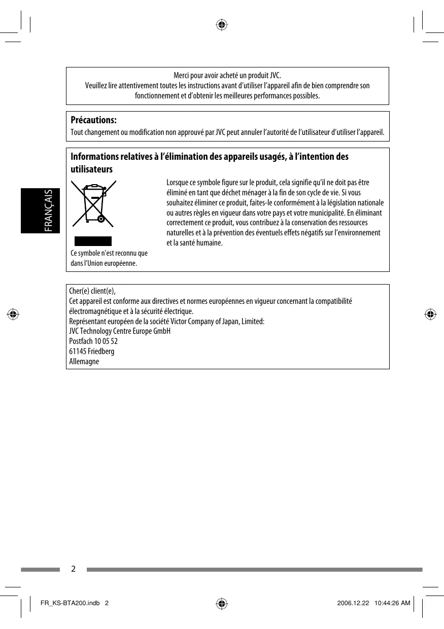 Français: Par la présente JVC déclare que l'appareil KS-BTA200 est conforme aux exigences essentielles et aux autres dispositions pertinentes de la directive 1999/5/CE.