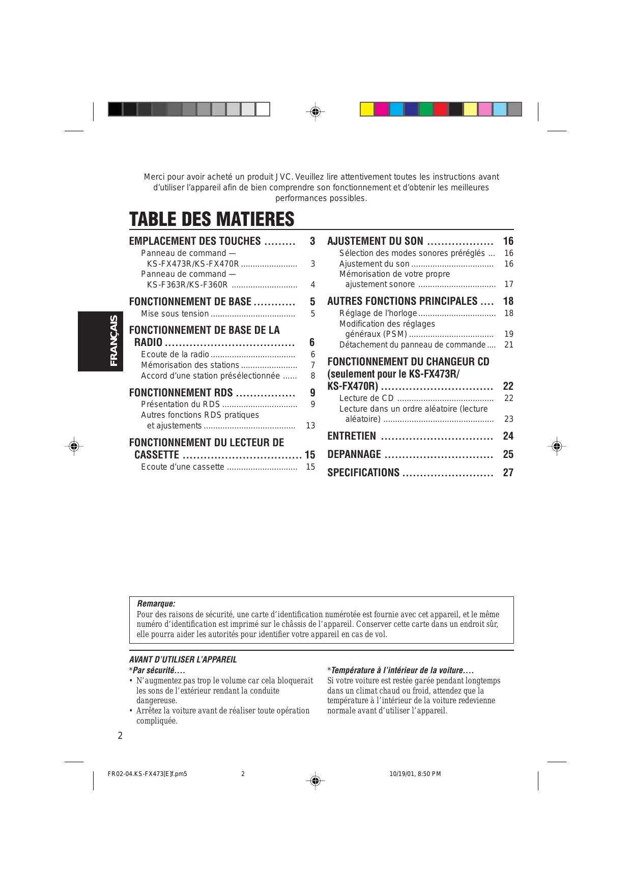 MODE D'EMPLOI KS-FX473R JVC
