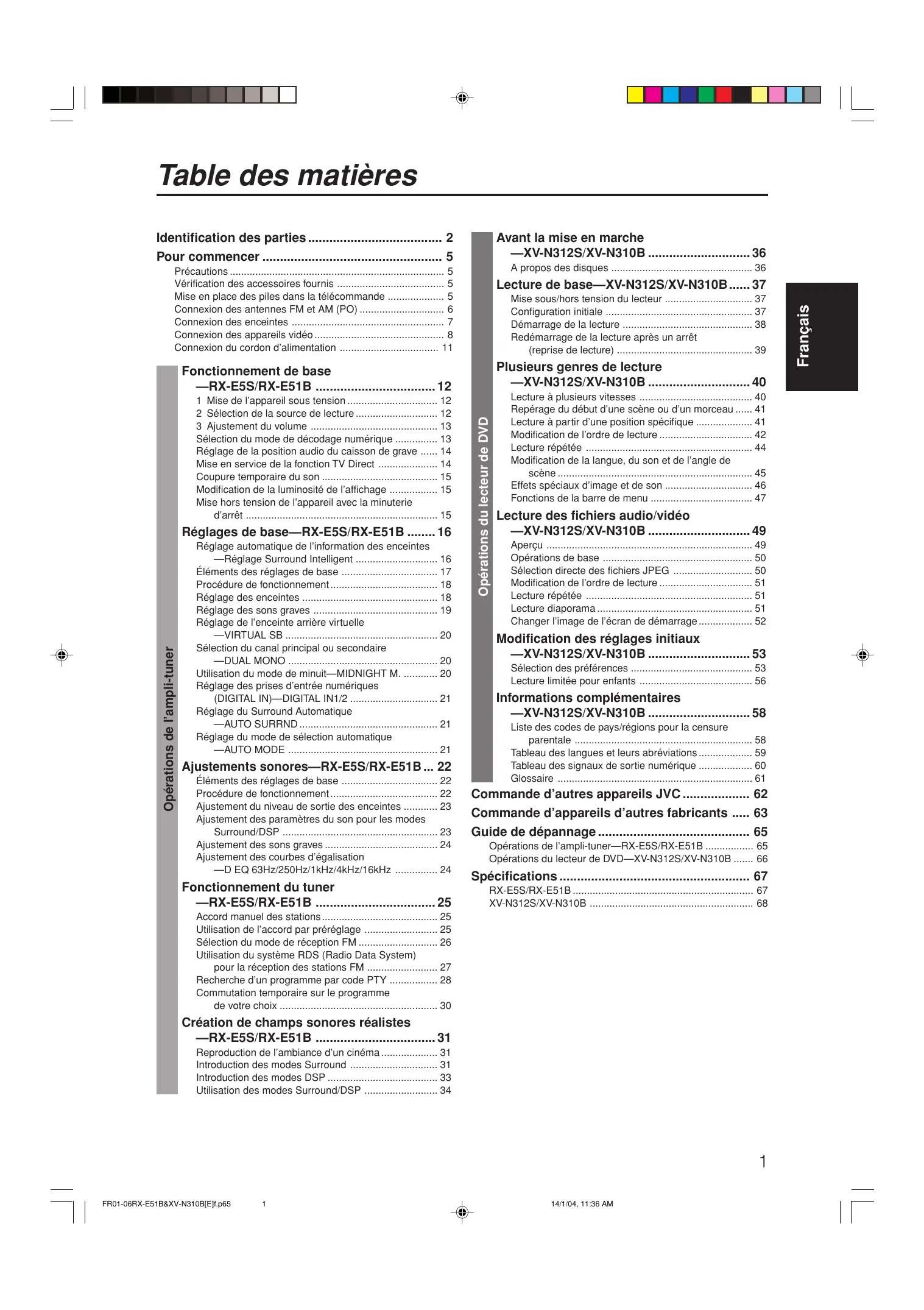 Commande d’autres appareils JVC 62 Commande d’appareils d’autres fabricants 63 Guide de dépannage 65 Opérations de l’ampli-tuner—RX-E5S/RX-E51B 65 Opérations du lecteur de DVD—XV-N312S/XV-N310B 66
