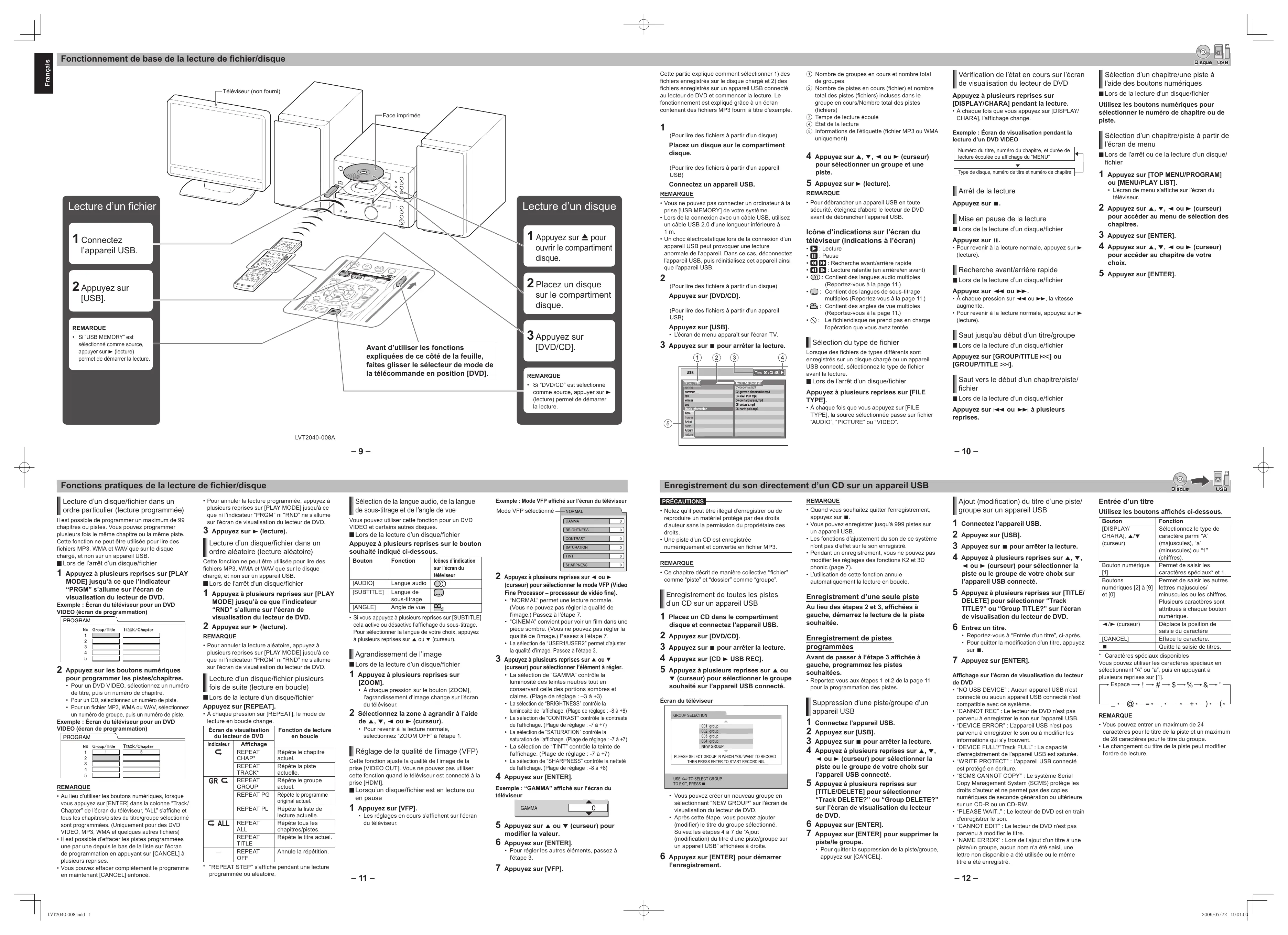 Lecture d'un disque/fichier dans un ordre particulier (lecture programmée). Il est possible de programmer un maximum de 99 chapitres ou pistes. Vous pouvez programmer plusieurs fois le même chapitre ou la même piste. Cette fonction ne peut être utilisée pour lire les fichiers MP3, WMA et WAV que sur le disque chargé, et non sur un appareil USB. Lors de l'arrêt d'un disque/fichier