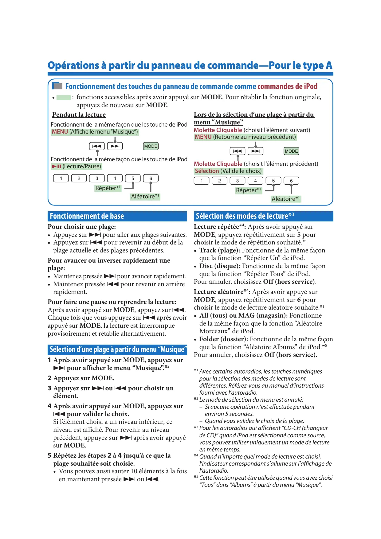 - Folder (dossier): Fonctionne de la même façon que la fonction “Aléatoire Albums” de iPod.*5 Pour annuler, choisissez Off (hors service). *1 Avec certains autoradios, les touches numériques pour la sélection des modes de lecture sont différentes. Référez-vous au manuel d’instructions fourni avec l’autoradio. *2 Le mode de sélection du menu est annulé; – Si aucune opération n’est effectuée pendant environ 5 secondes. – Quand vous validez le choix de la plage. *3 Pour les autoradios qui affichent “CD-CH (changeur de CD)” quand iPod est sélectionné comme source, vous pouvez utiliser uniquement un mode de lecture en même temps. *4 Quand n’importe quel mode de lecture est choisi, l’indicateur correspondant s’allume sur l’affichage de l’autoradio. *5 Cette fonction peut être utilisée quand vous avez choisi “Tous” dans “Albums” à partir du menu “Musique”. Opérations à partir du panneau de commande—Pour le type B Fonctionnement des touches du panneau de commande comme commandes de iPod