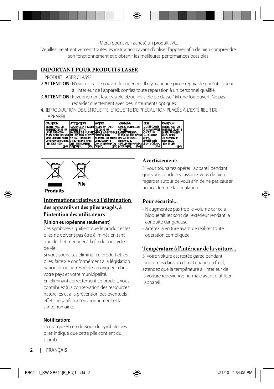 1/8/10 10:06:17 AM Merci pour avoir acheté un produit JVC. Veuillez lire attentivement toutes les instructions avant d’utiliser l’appareil afin de bien comprendre son fonctionnement et d’obtenir les meilleures performances possibles.