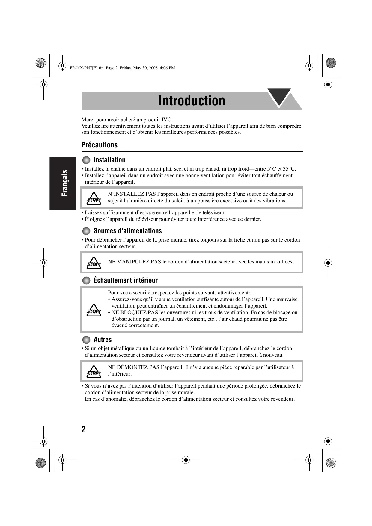 FR-NX-PN7[E].fm Page 2 Friday, May 30, 2008 4:06 PM Introduction Merci pour avoir acheté un produit JVC. Veuillez lire attentivement toutes les instructions avant d’utiliser l’appareil afin de bien compredre son fonctionnement et d’obtenir les meilleures performances possibles.