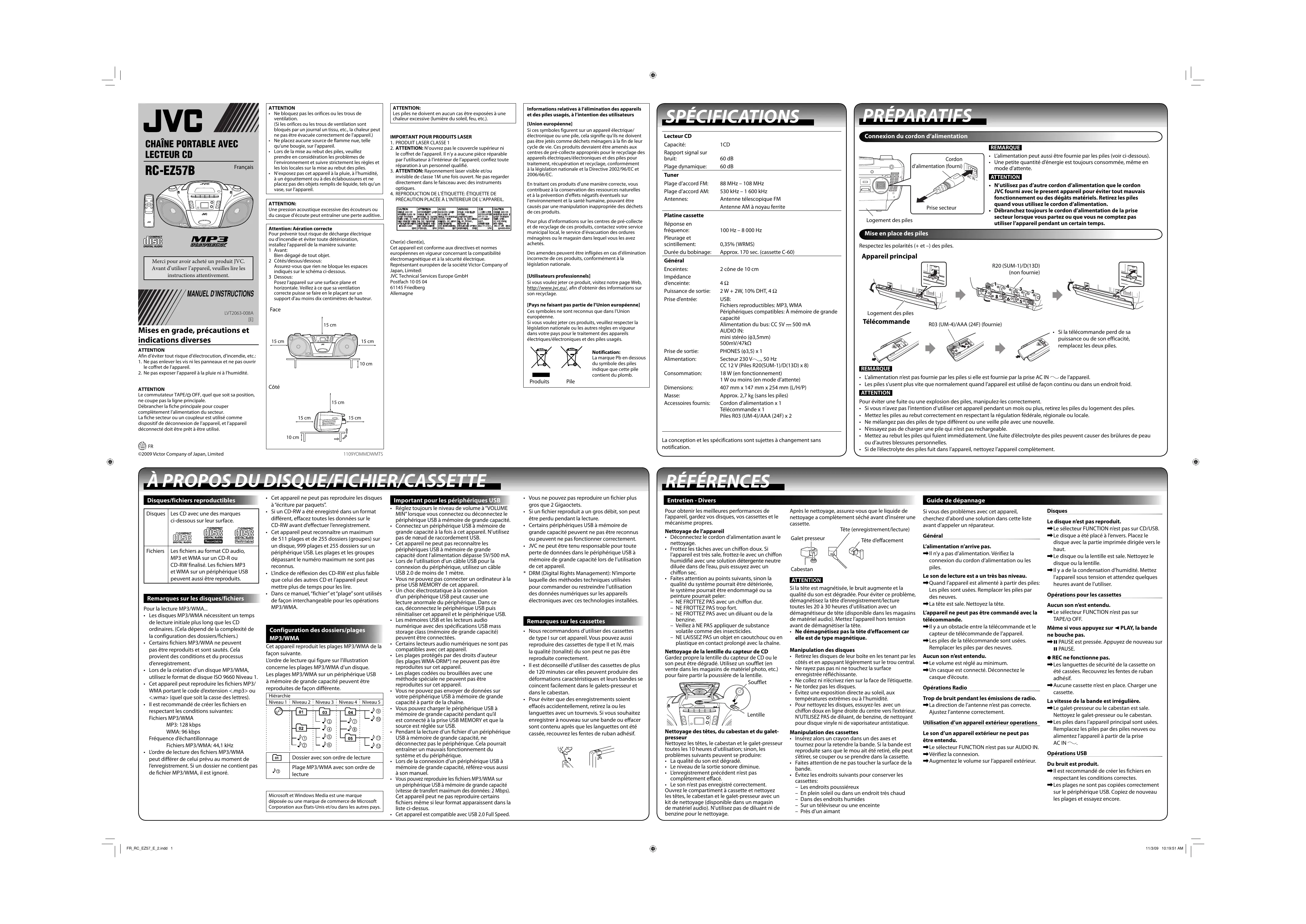 Disques/fichiers reproductibles Platine cassette Réponse en fréquence: Pleurage et scintillement: Durée du bobinage: Général Enceintes: Impédance d’enceinte: Puissance de sortie: Prise d’entrée: Dimensions: Masse: Accessoires fournis: 10 cm ©2009 Victor Company of Japan, Limited Lecteur CD Capacité: Rapport signal sur bruit: Plage dynamique: Tuner Plage d’accord FM: Plage d’accord AM: Antennes: Pile Côté 15 cm SPÉCIFICATIONS [Pays ne faisant pas partie de l’Union européenne] Ces symboles ne sont reconnus que dans l’Union européenne. Si vous voulez jeter ces produits, veuillez respecter la législation nationale ou les autres règles en vigueur dans votre pays pour le traitement des appareils électriques/électroniques et des piles usagés. Face 15 cm Informations relatives à l’élimination des appareils et des piles usagés, à l’intention des utilisateurs Logement des piles Télécommande R03 (UM-4)/AAA (24F) (fournie)