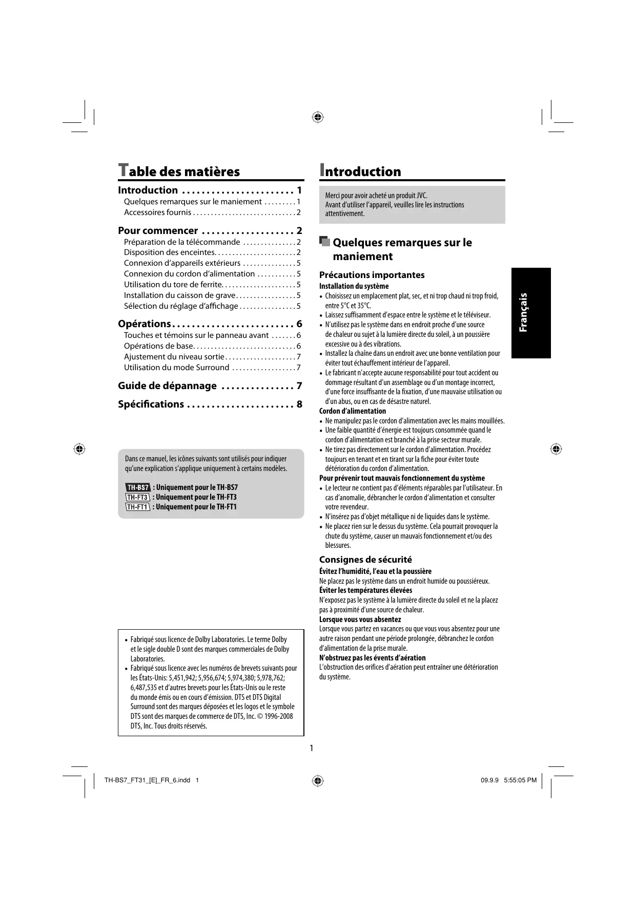 - Ajustement du niveau sorti Utilisation du mode Surround . SYooa Guide de dépannage Spécifica Dans c manuel, les icônes suivants sont utilisés pour indiquer qu'une explication s'applique uniquement à certains modèles. : Uniquement pour le TH-BS7 niquement pour le TH-FT3 Iniquement pour Le TH-FT1 Fabriqué sous licence de Dolby Laboratories. Le terme Dolby etlesigle double D sont des marques commerciales de Dolby Laboratories. Fabriqué sous licence avec les numéros de brevets suivants pour les États-Unis: 5 451,942; 5,956,674;5,974,380;5,978,762; 6,487,535 et d'autres brevets pour les États-Unis ou le reste du monde émis ou en cours d'émission DTS et DTS Digital Surround sont des marques déposées etes logos et le symbole DTS sont des marques de commerce de DTS, Inc. © 1996-2008 DTS, Inc. Tous droits réservés. | | THeSr Frot EL FR Gras 1 Merci pour avoiracheté un produit VC. Avant d'utiliser l'appareil veuils ir es instructions attentivement. M Quelques remarques sur le maniement Précaut portantes Installation du système « Choisissez un emplacement plat, sec, etni trop chaud ni trop froid, entre °C et 35%C. p. 7