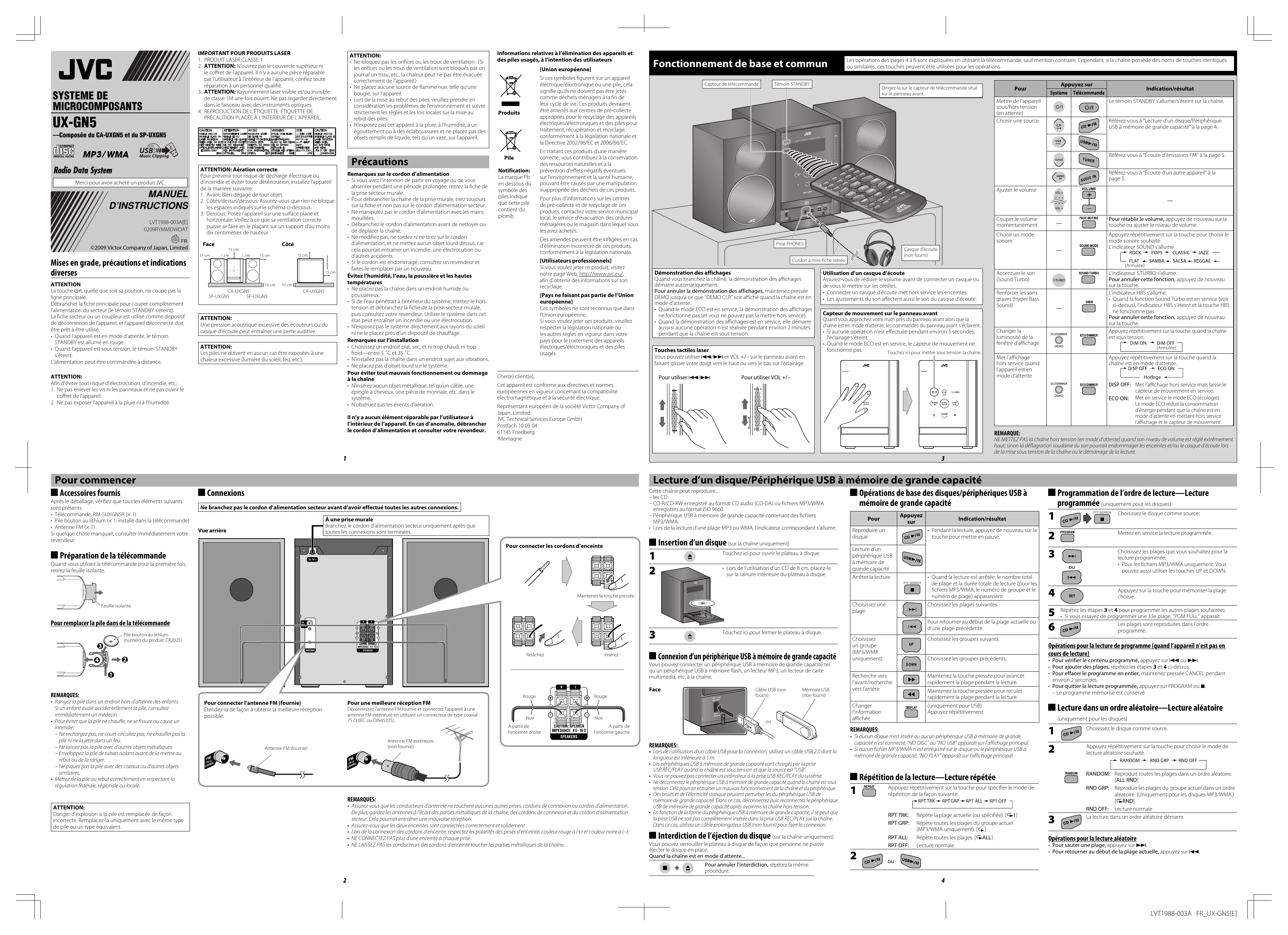- Mettez de la pile au rebut correctement en respectant la régulation fédérale, régionale ou locale. Indication/résultat Référez-vous à “Écoute d’émissions FM” à la page 5. Cher(e) client(e), Cet appareil est conforme aux directives et normes européennes en vigueur concernant la compatibilité électromagnétique et à la sécurité électrique. Représentant européen de la société Victor Company of Japan, Limited: JVC Technical Services Europe GmbH Postfach 10 05 04 61145 Friedberg Allemagne Pour commencer Accessoires fournis Appuyez sur Système Télécommande Mettre de l’appareil sous/hors tension (en attente) Choisir une source