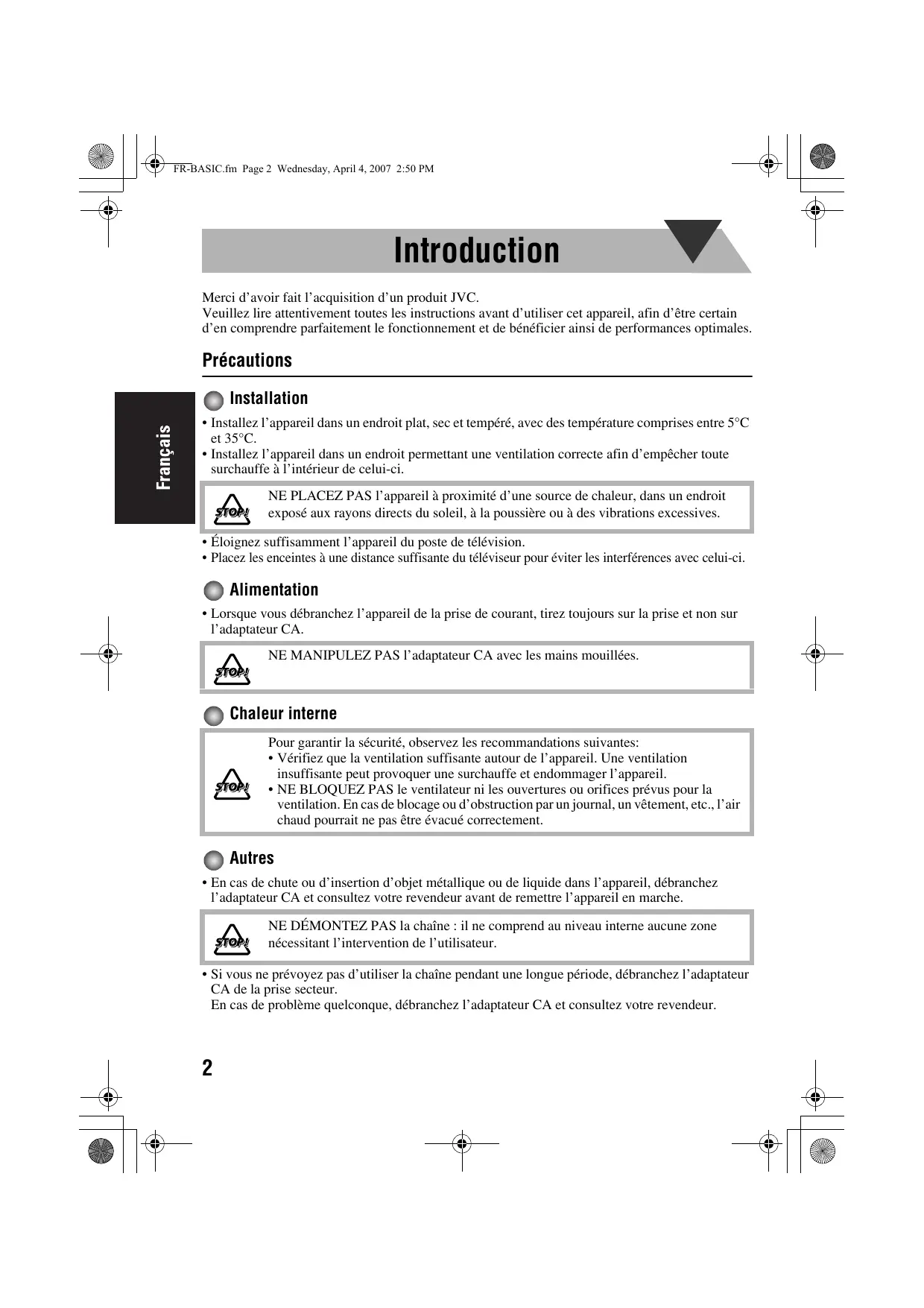 FR-BASIC.fm Page 2 Wednesday, April 4, 2007 2:50 PM Introduction Merci d’avoir fait l’acquisition d’un produit JVC. Veuillez lire attentivement toutes les instructions avant d’utiliser cet appareil, afin d’être certain d’en comprendre parfaitement le fonctionnement et de bénéficier ainsi de performances optimales. Précautions Installation
