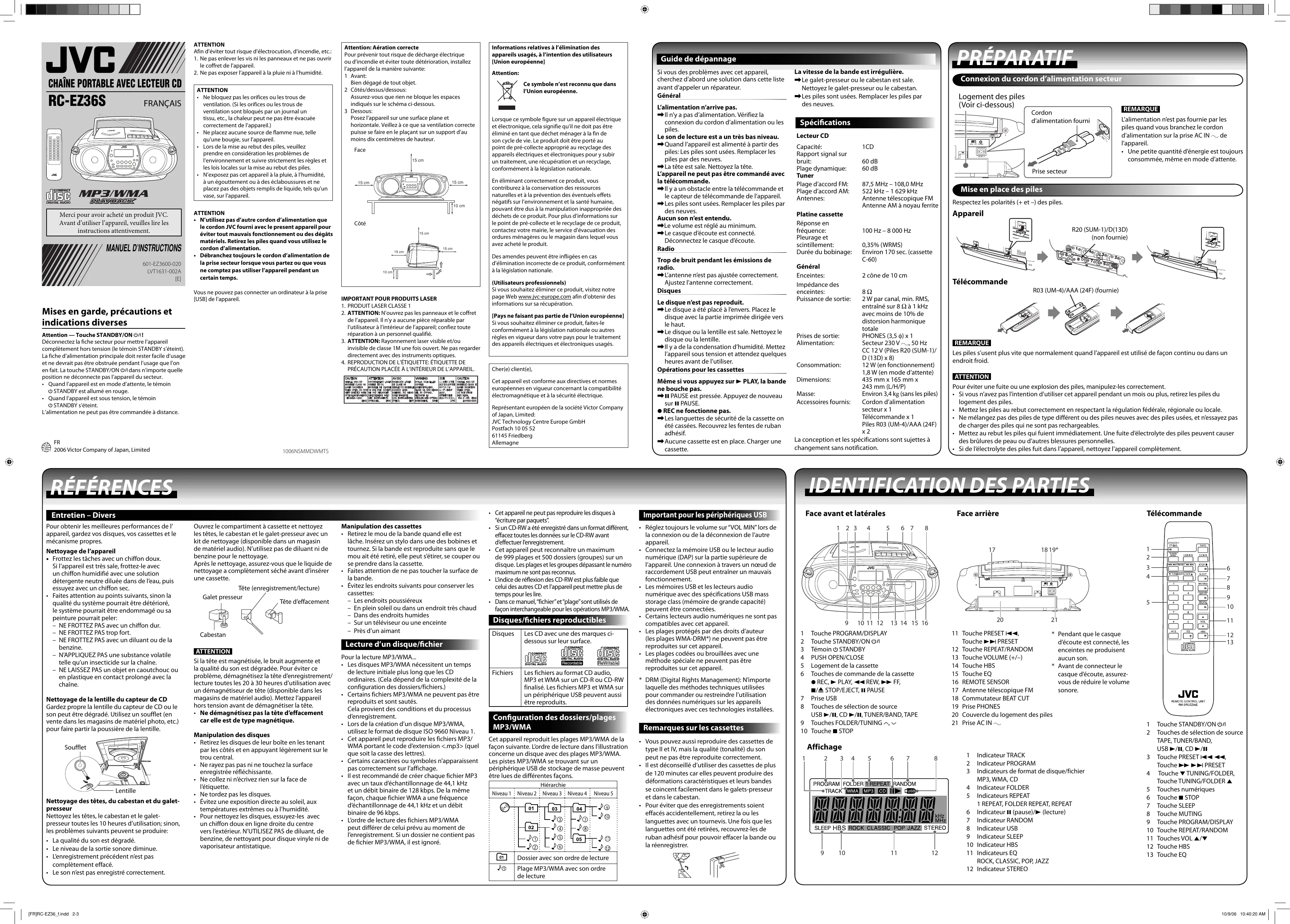 2006 Victor Company of Japan, Limited 1006NSMMDWMTS Si vous des problèmes avec cet appareil, cherchez d’abord une solution dans cette liste avant d’appeler un réparateur. Général L’alimentation n’arrive pas. \ Il n’y a pas d’alimentation. Vérifiez la connexion du cordon d’alimentation ou les piles. Le son de lecture est a un très bas niveau. \ Quand l’appareil est alimenté à partir des piles: Les piles sont usées. Remplacer les piles par des neuves. \ La tête est sale. Nettoyez la tête. L’appareil ne peut pas être commandé avec la télécommande. \ Il y a un obstacle entre la télécommande et le capteur de télécommande de l’appareil. \ Les piles sont usées. Remplacer les piles par des neuves. Aucun son n’est entendu. \Le volume est réglé au minimum. \ Le casque d’écoute est connecté. Déconnectez le casque d’écoute. Radio Trop de bruit pendant les émissions de radio. \ L’antenne n’est pas ajustée correctement. Ajustez l’antenne correctement. Disques Le disque n’est pas reproduit. \ Le disque a été placé à l’envers. Placez le disque avec la partie imprimée dirigée vers le haut. \ Le disque ou la lentille est sale. Nettoyez le disque ou la lentille. \ Il y a de la condensation d’humidité. Mettez l’appareil sous tension et attendez quelques heures avant de l’utiliser. Opérations pour les cassettes Même si vous appuyez sur 3 PLAY, la bande ne bouche pas. \ 8 PAUSE est pressée. Appuyez de nouveau sur 8 PAUSE. ¶ REC ne fonctionne pas. \ Les languettes de sécurité de la cassette on été cassées. Recouvrez les fentes de ruban adhésif. \ Aucune cassette est en place. Charger une cassette. La vitesse de la bande est irrégulière. \ Le galet-presseur ou le cabestan est sale. Nettoyez le galet-presseur ou le cabestan. \ Les piles sont usées. Remplacer les piles par des neuves. Soufflet Lentille Nettoyage des têtes, du cabestan et du galetpresseur Nettoyez les têtes, le cabestan et le galetpresseur toutes les 10 heures d’utilisation; sinon, les problèmes suivants peuvent se produire: