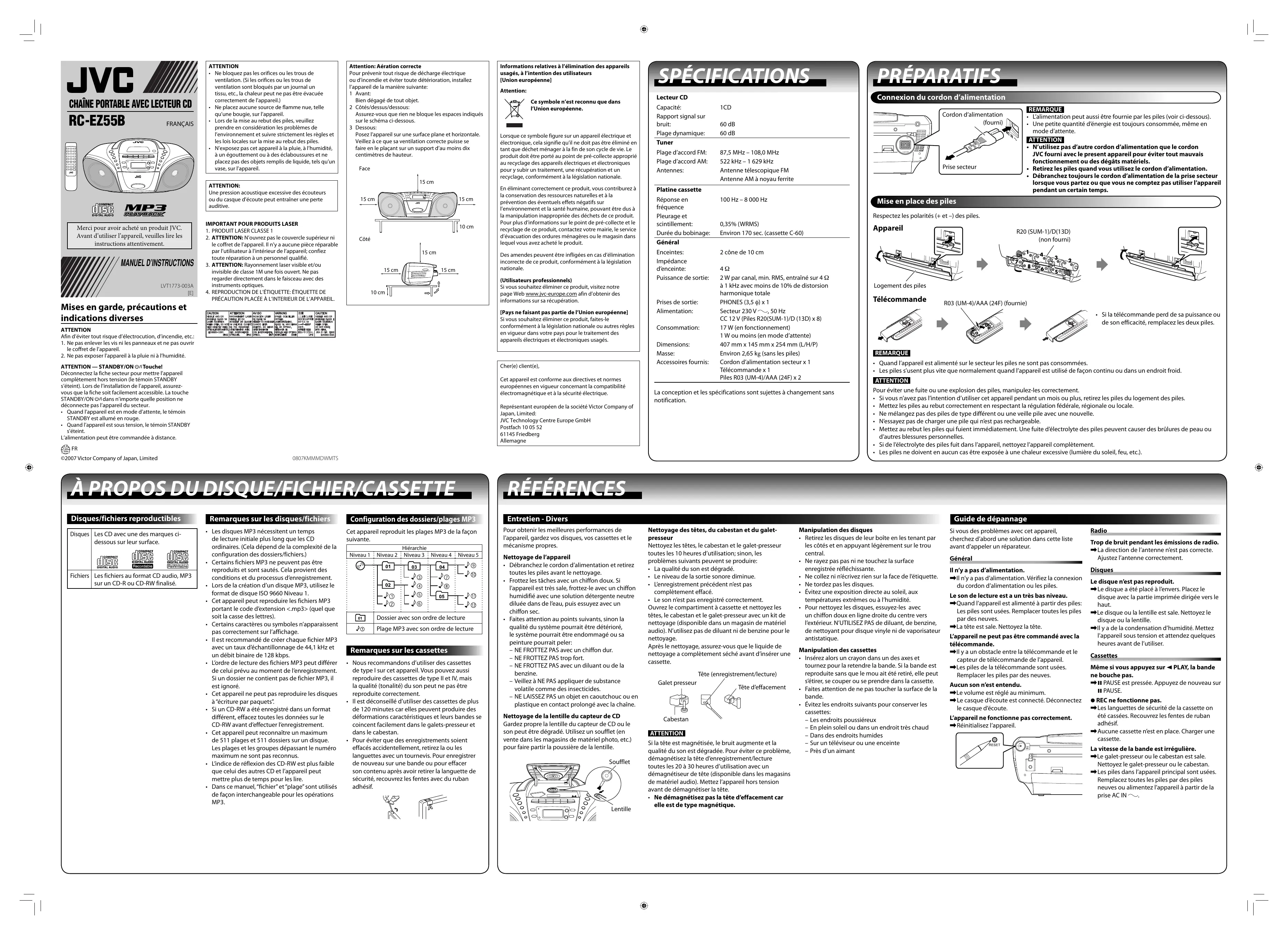 2 W par canal, min. RMS, entraîné sur 4 Ω à 1 kHz avec moins de 10% de distorsion harmonique totale PHONES (3,5 φ) x 1 Secteur 230 V , 50 Hz CC 12 V (Piles R20(SUM-1)/D (13D) x 8) 17 W (en fonctionnement) 1 W ou moins (en mode d’attente) 407 mm x 145 mm x 254 mm (L/H/P) Environ 2,65 kg (sans les piles) Cordon d’alimentation secteur x 1 Télécommande x 1 Piles R03 (UM-4)/AAA (24F) x 2 La conception et les spécifications sont sujettes à changement sans notification. Représentant européen de la société Victor Company of Japan, Limited: JVC Technology Centre Europe GmbH Postfach 10 05 52 61145 Friedberg Allemagne Appareil R20 (SUM-1)/D(13D) (non fourni) Logement des piles Télécommande R03 (UM-4)/AAA (24F) (fournie)