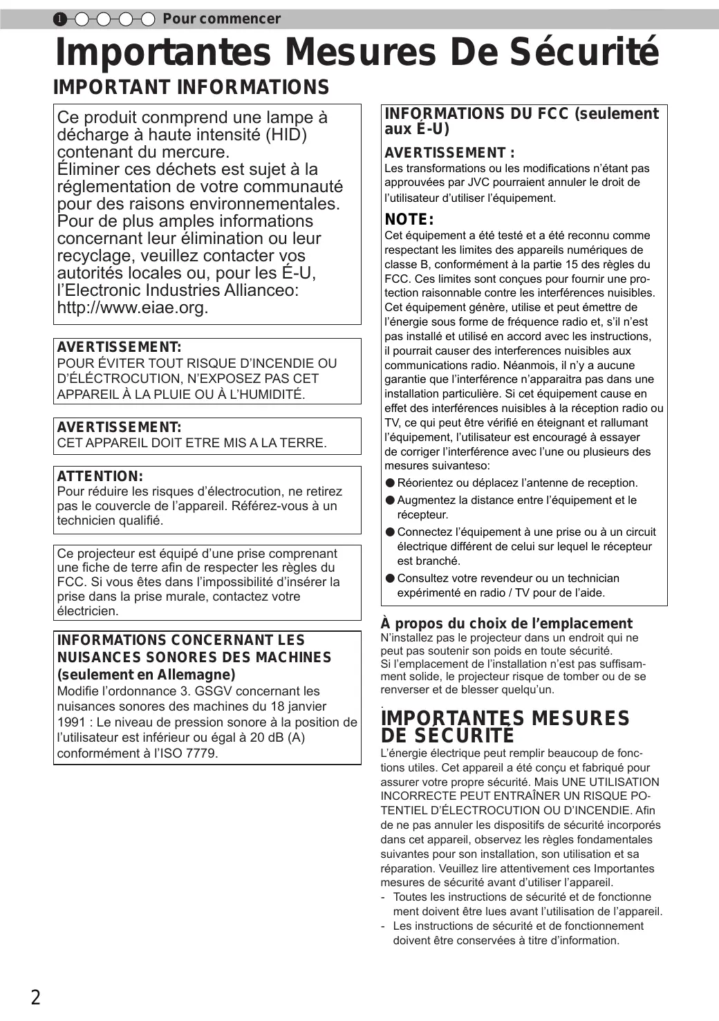 Les transformations ou les modifications n’étant pas approuvées par JVC pourraient annuler le droit de l’utilisateur d’utiliser l’équipement. NOTE: Cet équipement a été testé et a été reconnu comme respectant les limites des appareils numériques de classe B, conformément à la partie 15 des règles du FCC. Ces limites sont conçues pour fournir une protection raisonnable contre les interférences nuisibles. Cet équipement génère, utilise et peut émettre de l’énergie sous forme de fréquence radio et, s’il n’est pas installé et utilisé en accord avec les instructions, il pourrait causer des interferences nuisibles aux communications radio. Néanmois, il n’y a aucune garantie que l’interférence n’apparaitra pas dans une installation particulière. Si cet équipement cause en effet des interférences nuisibles à la réception radio ou TV, ce qui peut être vérifié en éteignant et rallumant l’équipement, l’utilisateur est encouragé à essayer de corriger l’interférence avec l’une ou plusieurs des mesures suivanteso: ● Réorientez ou déplacez l’antenne de reception. ● Augmentez la distance entre l’équipement et le récepteur. ● Connectez l’équipement à une prise ou à un circuit électrique différent de celui sur lequel le récepteur est branché. ● Consultez votre revendeur ou un technician expérimenté en radio / TV pour de l’aide. À propos du choix de l’emplacement N’installez pas le projecteur dans un endroit qui ne peut pas soutenir son poids en toute sécurité. Si l’emplacement de l’installation n’est pas suffisamment solide, le projecteur risque de tomber ou de se renverser et de blesser quelqu’un.