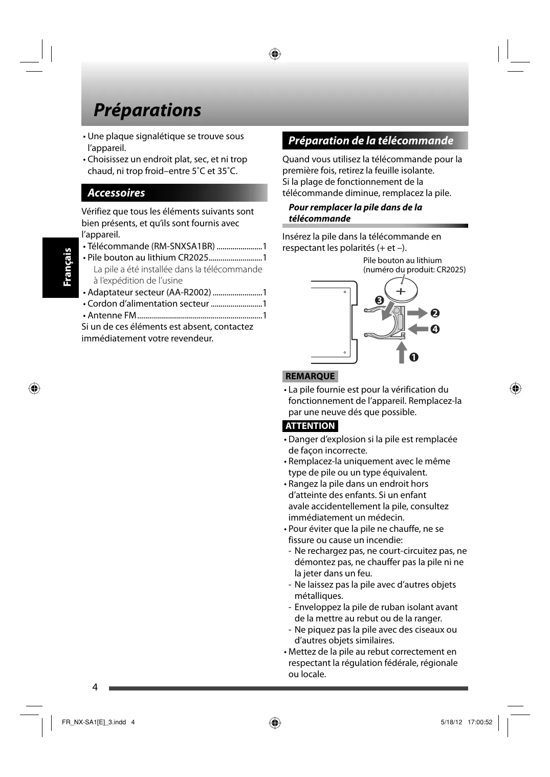 Table des matières Préparations 4 Accessoires 4 Préparation de la télécommande 4