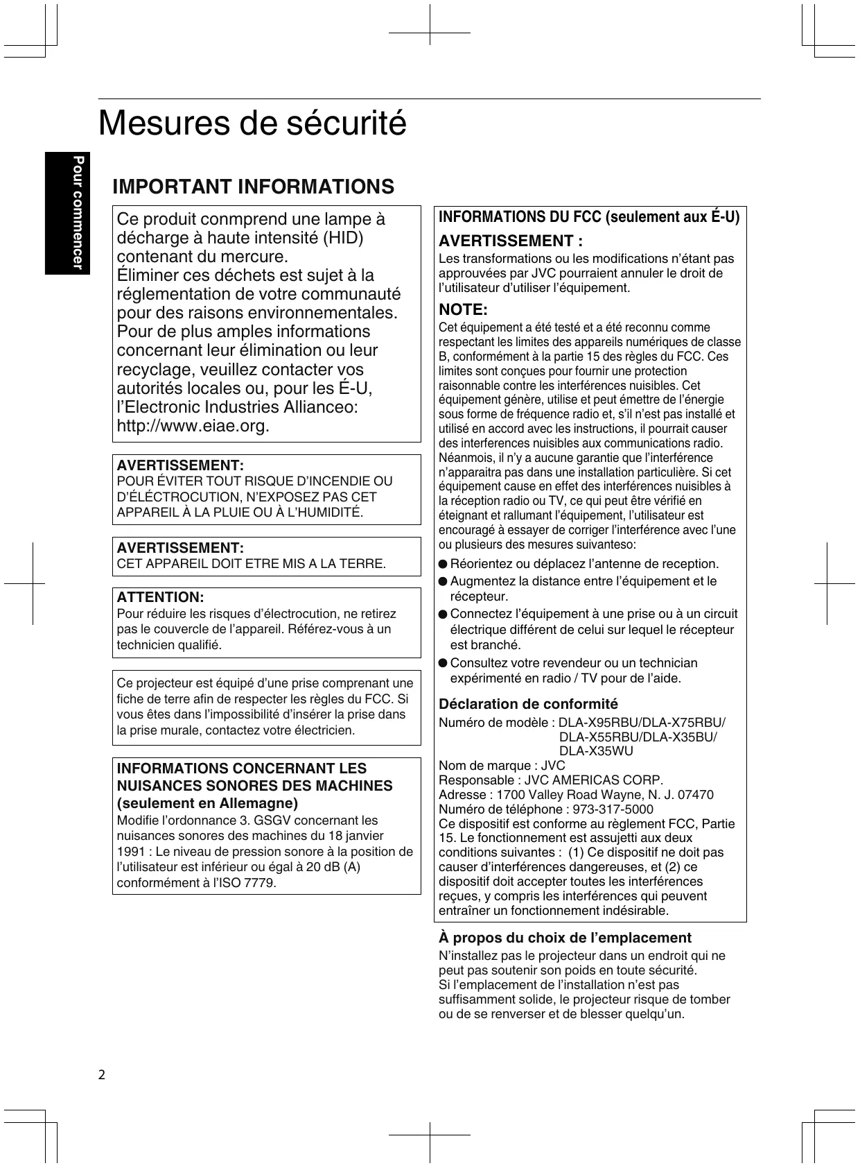 Numéro de modèle : DLA-X95RBU/DLA-X75RBU/ DLA-X55RBU/DLA-X35BU/ DLA-X35WU Nom de marque : JVC Responsable : JVC AMERICAS CORP. Adresse : 1700 Valley Road Wayne, N. J. 07470 Numéro de téléphone : 973-317-5000 Ce dispositif est conforme au règlement FCC, Partie 15. Le fonctionnement est assujetti aux deux conditions suivantes : (1) Ce dispositif ne doit pas causer d’interférences dangereuses, et (2) ce dispositif doit accepter toutes les interférences reçues, y compris les interférences qui peuvent entraîner un fonctionnement indésirable.