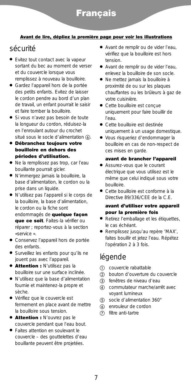 Assurez-vous que le courant électrique que vous utilisez est le même que celui indiqué sous votre bouilloire. © Cette bouilloire est conforme à la Directive 89/336/CEE de la C.E avant d'utiliser votre appareil pour la première fois «Retirez l'emballage et les étiquettes, le cas échéant. Remplissez jusqu'au repère ‘MAX', faites bouilir et jetez l'eau. Répétez l'opération 2 à 3 fois
