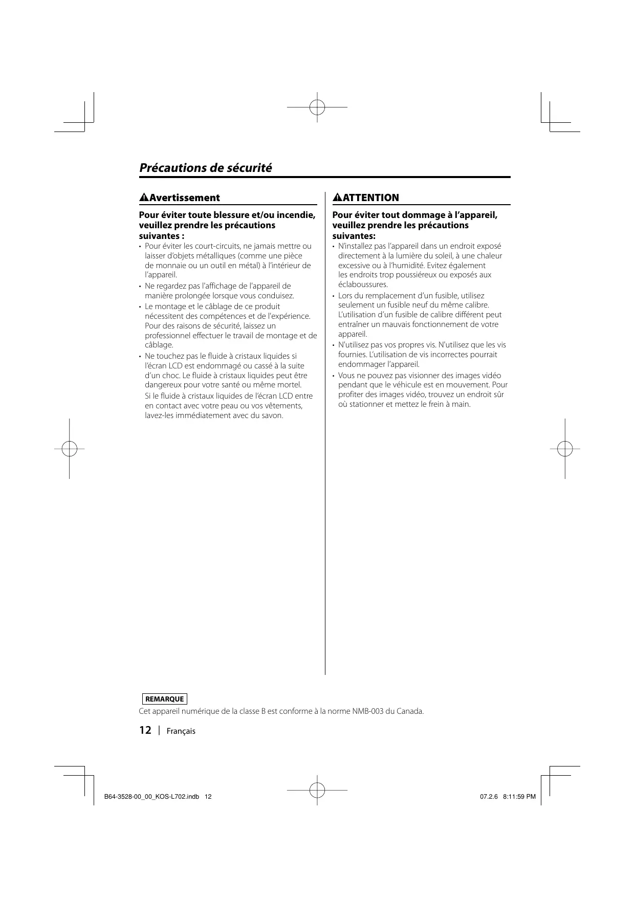 • Ne regardez pas l'affichage de l'appareil de manière prolongée lorsque vous conduisez. • Le montage et le câblage de ce produit nécessitent des compétences et de l'expérience. Pour des raisons de sécurité, laissez un professionnel effectuer le travail de montage et de câblage. • Ne touchez pas le fluide à cristaux liquides si l’écran LCD est endommagé ou cassé à la suite d’un choc. Le fluide à cristaux liquides peut être dangereux pour votre santé ou même mortel. Si le fluide à cristaux liquides de l’écran LCD entre en contact avec votre peau ou vos vêtements, lavez-les immédiatement avec du savon.