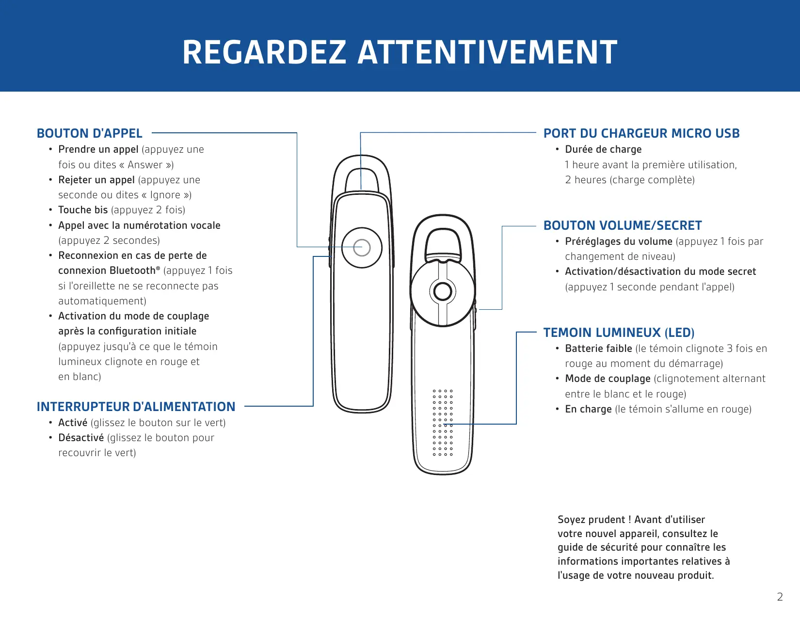 - Consultez les questions les plus fréquemment posées sur nos produits et le guide de l'utilisateur MyHeadset™ Restez à proximité de votre téléphone La technologie Bluetooth offre une portée maximale de 10 mètres entre votre téléphone et votre appareil sans risque de perte de connexion ou de dégradation de la qualité audio. Soyez attentif (uniquement en anglais) Cette oreillette vous informe automatiquement des alertes suivantes :